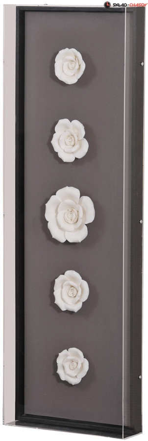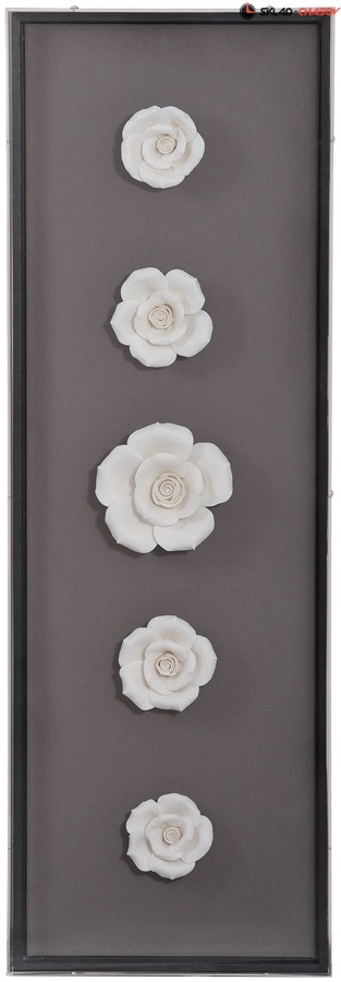 Панно содержит 5 белых цветов из керамики. Панно целиком помещено в стеклянную коробку. Цвет рамы внутри панно - чёрный.