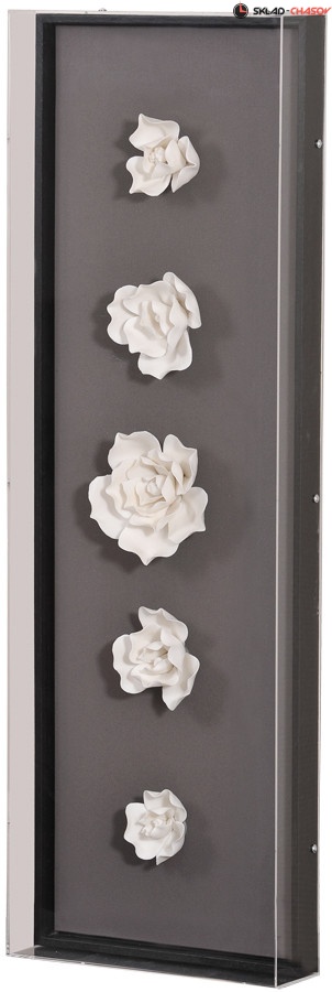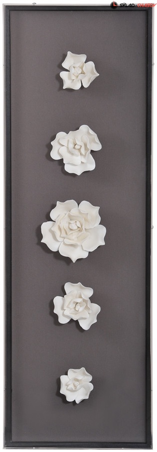 Панно содержит 5 белых цветов из керамики. Панно целиком помещено в стеклянную коробку. Цвет рамы внутри панно - чёрный.
