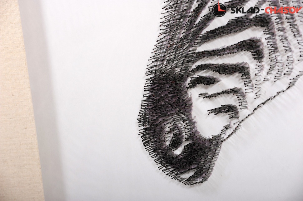 Панно Зебра выполнено из металлических гвоздей, закреплённых в холсте в форме головы зебры.