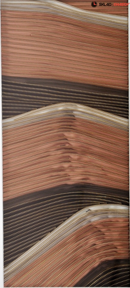 На серо-бежевом холсте закреплены текстильные застёжки-молнии оттенков коричневого цвета, которые, перекрывая друг друга, образуют крупные барханы.