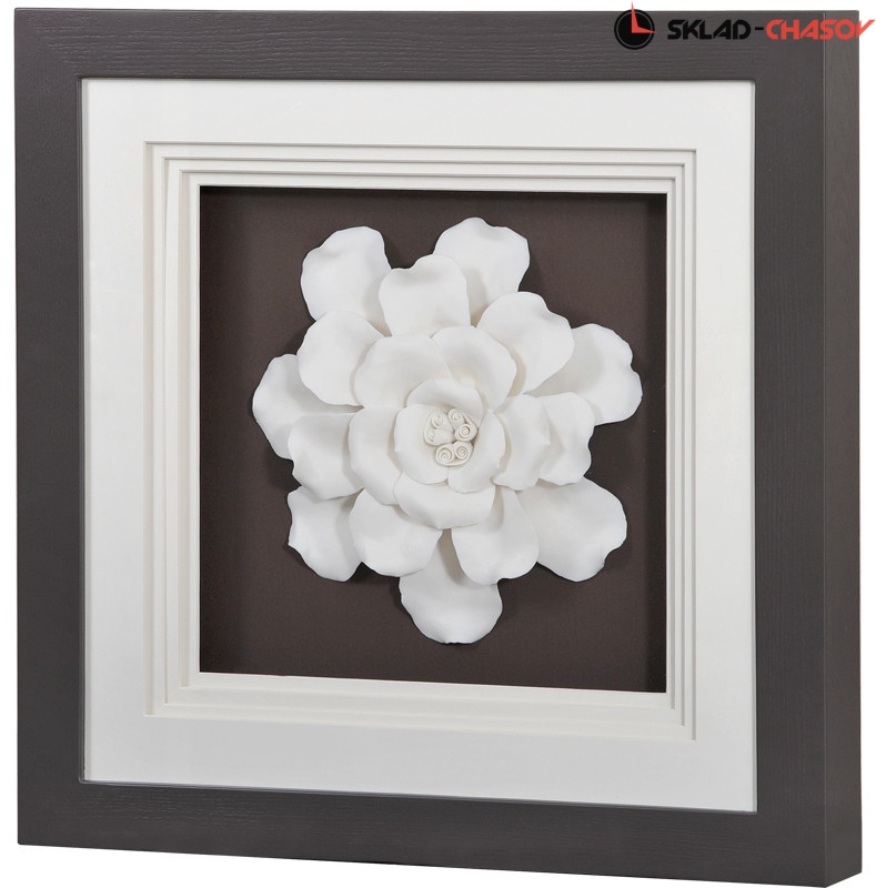 Основным декортивным элементом панно служит белый цветок из керамики. Цветок покоится на подложке кофейного цвета из холста. 4-слойное паспарту сделано из белого пластика. Сверху композицию защищает стекло.