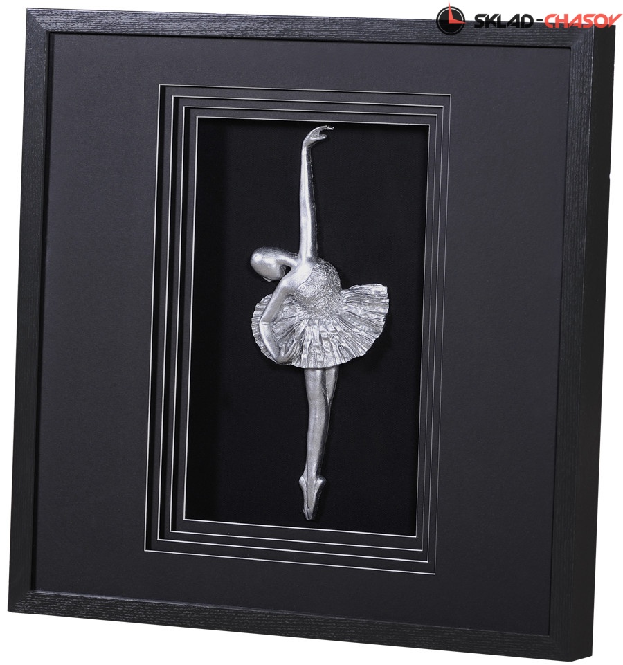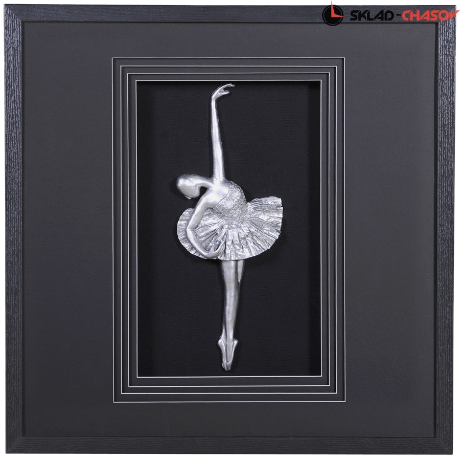 Панно из серии посвящённой балету. На чёрном фоне панно размещена серебристая фигурка танцующей балерины.