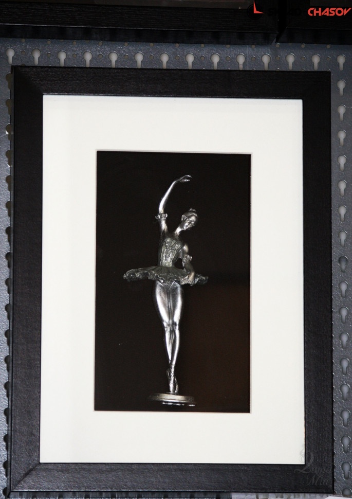 На чёрном фоне панно размещена фигурка балерины в четвёртой позиции. Скульптура балерины цвета патинированного серебра. Панно покрыто стеклом.