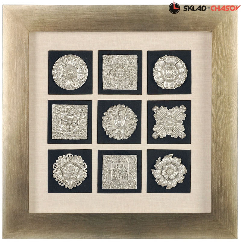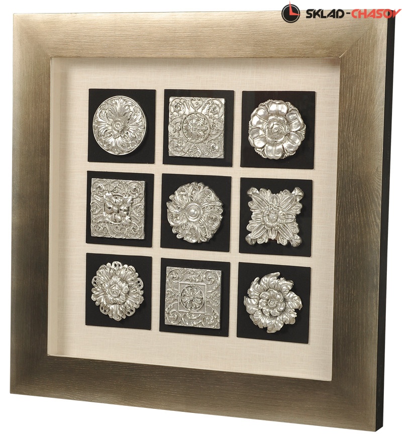 Панно настенное "9 декоров". Настенное панно в толстой квадратной серой деревянной раме с фронтальным стеклом, под которым в центре на чёрном поле симметрично размещены девять серебристых объёмных декоративных элементов. Размеры: высота и ширина 90 см, глубина 6.5 см. Артикул 16824.