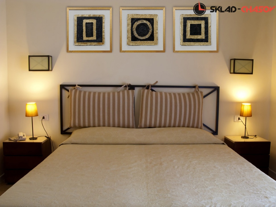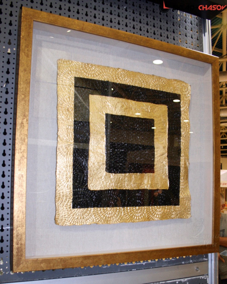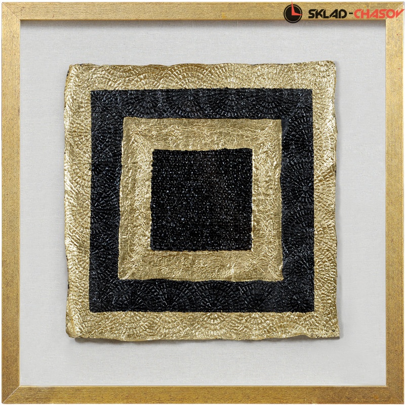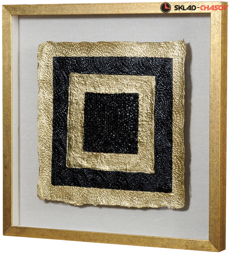 Внутренняя геометрическая картина из вписанного светло-золотого квадрата в золотой квадрат сделана из металла золотого и чёрного цвета.