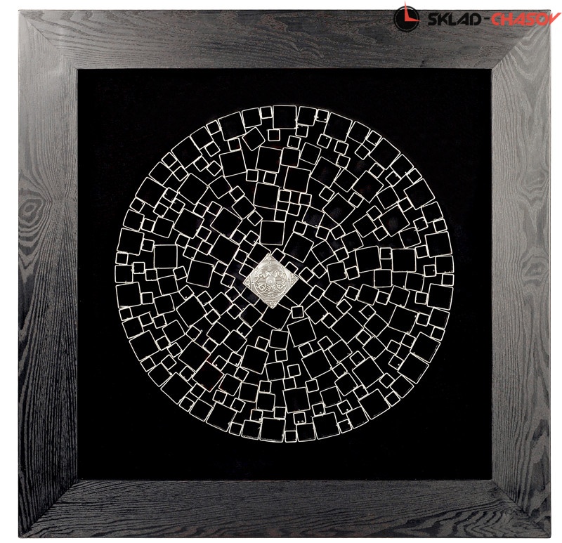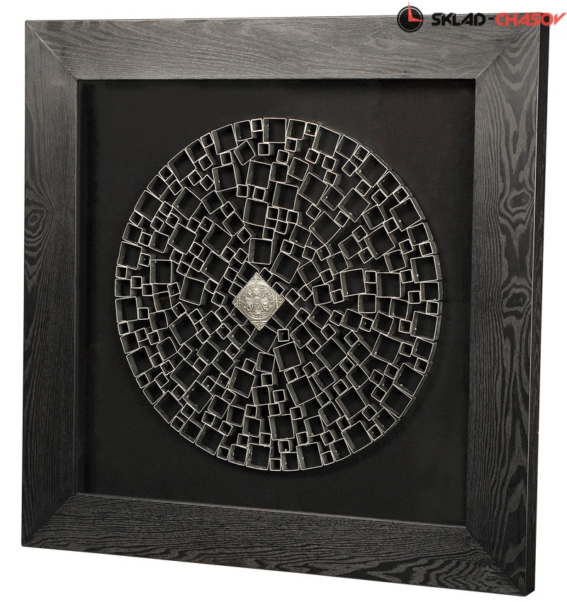 Панно настенное "Лабиринт" в чёрной деревянной шпонированной раме. Серебристое панно с круговым лабиринтом, составленным из металлических квадров различной ширины. Размеры: высота 90 см, ширина 90 см, глубина 8.5 см. Артикул 18911A.