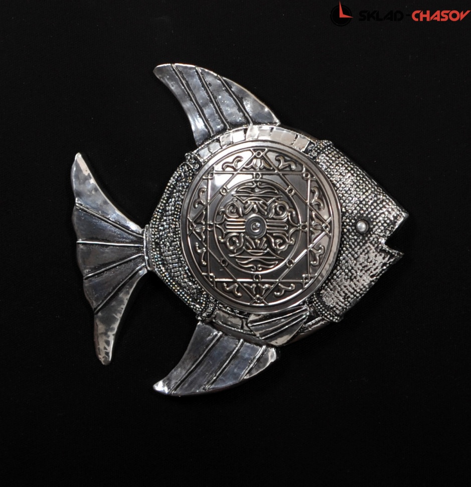 На чёрном холсте квадратного панно расположена металлическая рыба серебристого цвета. В центре рыбы размещён круглый герб с витиеватым орнаментом.