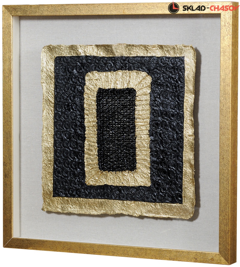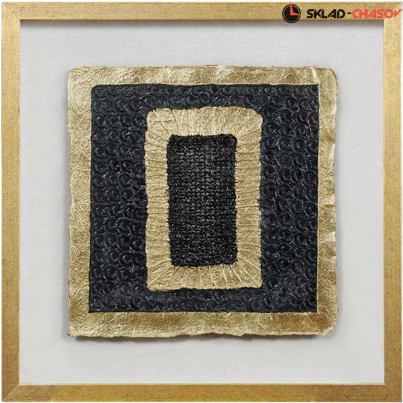 Внутренняя геометрическая картина из вписанного золотого прямоугольника в светло-золотой квадрат сделана из металла золотого и чёрного цвета.