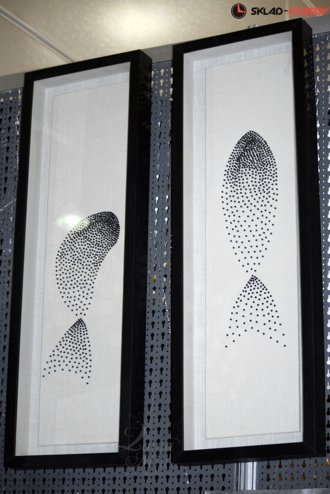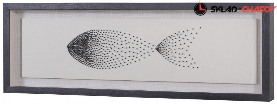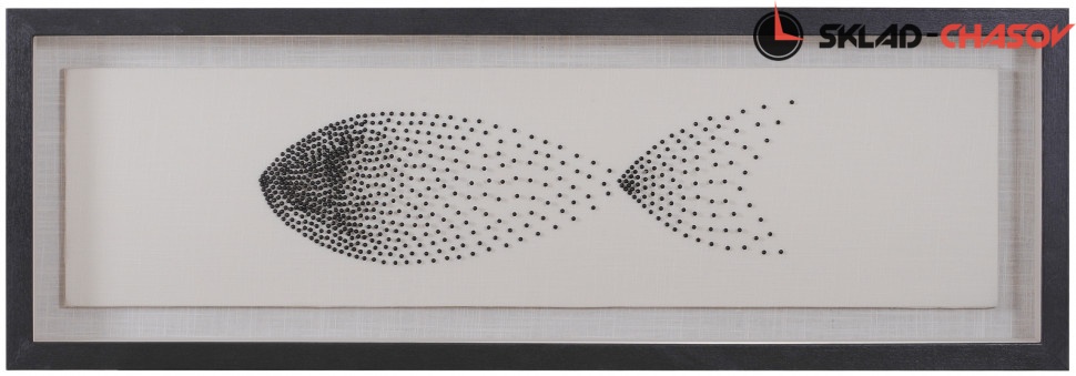 Под стеклом на бежевом фоне из ткани английскими булавками чёрного цвета создана фигура рыбки.
