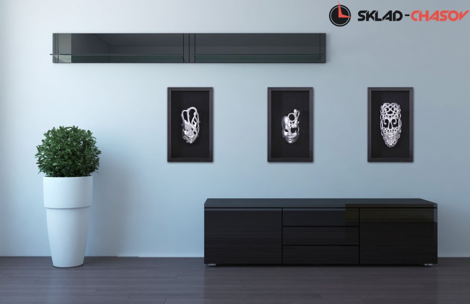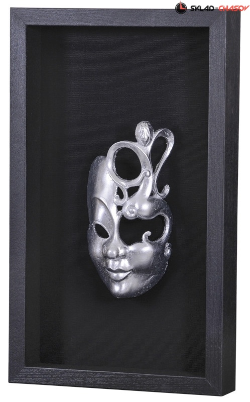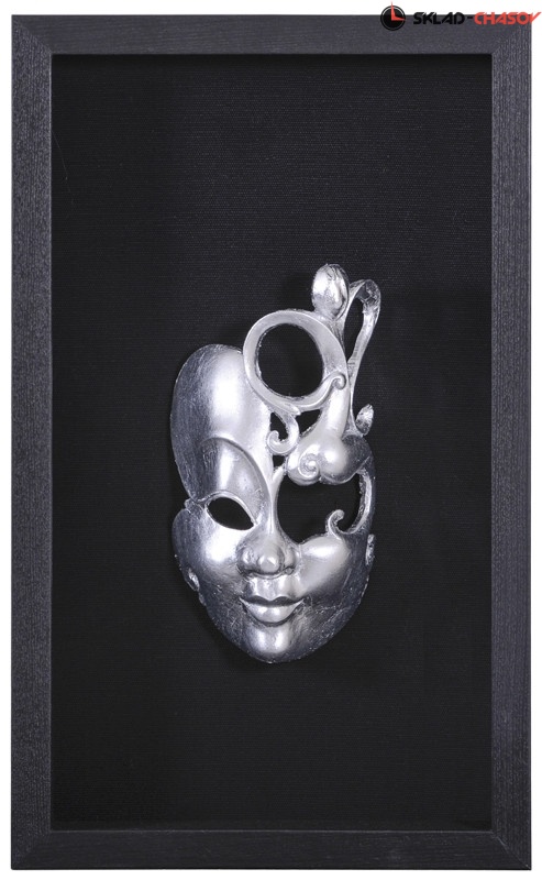 На чёрном фоне панно закреплена объёмная маскарадная маска, выполненная из композитного материала и покрытая металлизированной плёнкой.