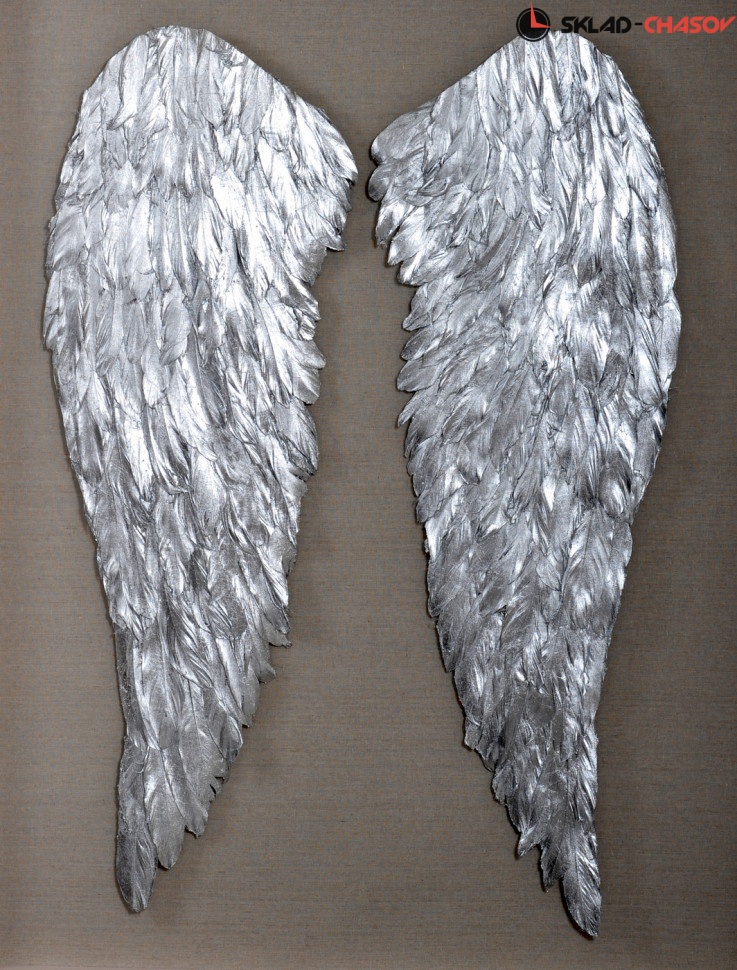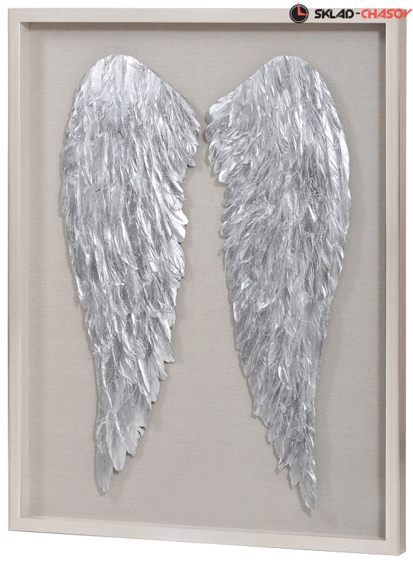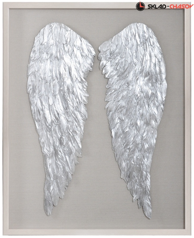 На бежевом холсте закреплены два крыла из перьев серебристого цвета. Рама серебристая.