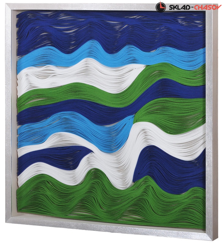 Панно Морские волны изготовлено из полос цветной бумаги, которые собраны волнообразно. Многослойность листов создаёт объём и эффект движения. Рама серебристого цвета.