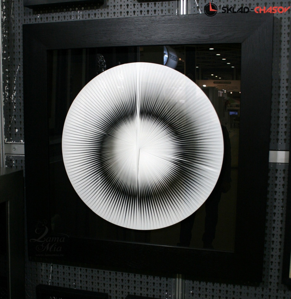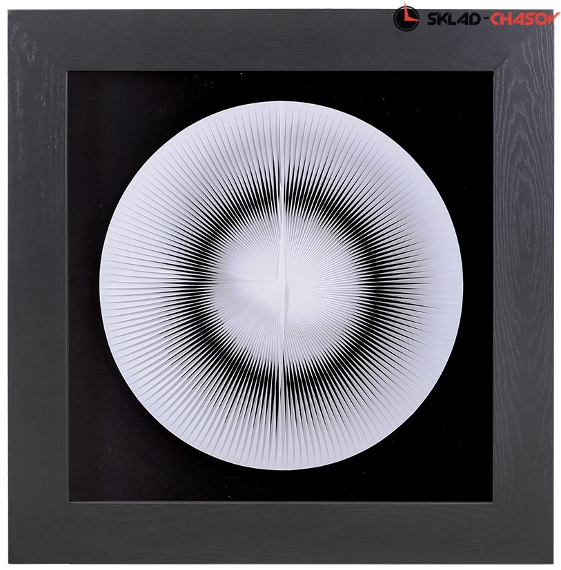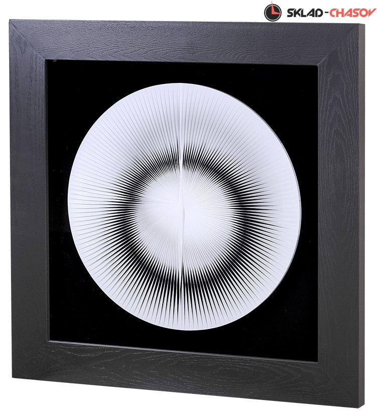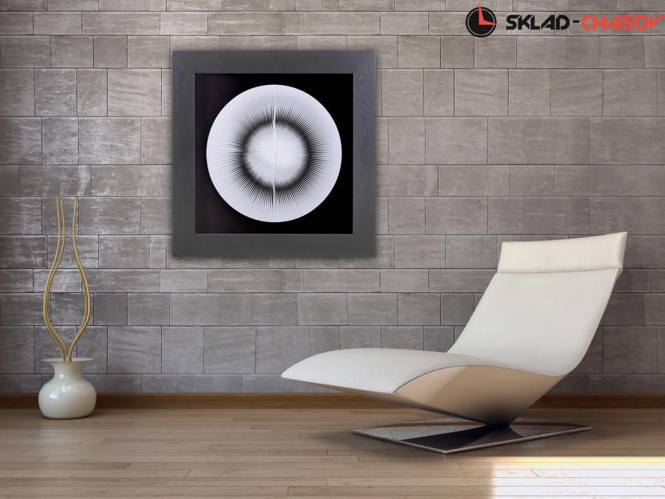 Панно в современном стиле "Иллюзия круг". Панно заключено в чёрную шпонированную деревянную раму, с внешней стороны покрытую стеклом. Размеры: высота 90 см, ширина 90 см, глубина 5 см. Артикулы: 22848.