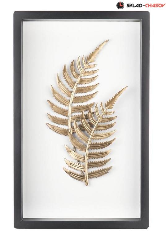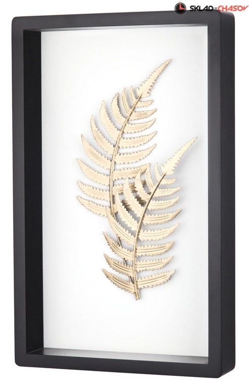 Декоративное настенное панно в матовой деревянной раме черного цвета с белой подложкой. Объемные листья растений выполнены из металла и тонированы в золотистый цвет. Размеры 41 x 25 x 5 см