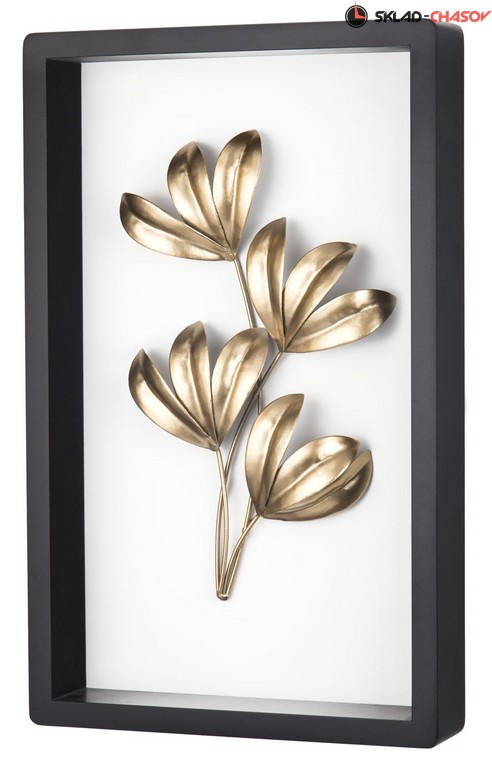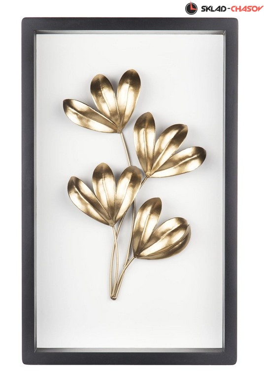 Декоративное настенное панно в матовой деревянной раме черного цвета с белой подложкой. Объемные листья растений выполнены из металла и тонированы в золотистый цвет. Размеры 41 x 25 x 5 см