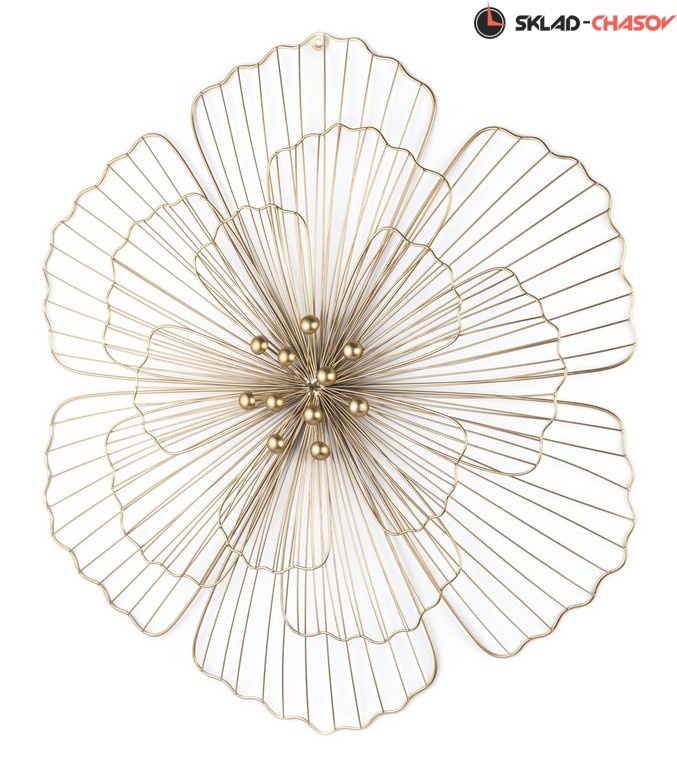 Объемное настенное панно изготовлено из металла с золотистым покрытием. Лепестки из тонких прутьев расположены на разных уровнях. Размеры 68 x 65 x 9 см