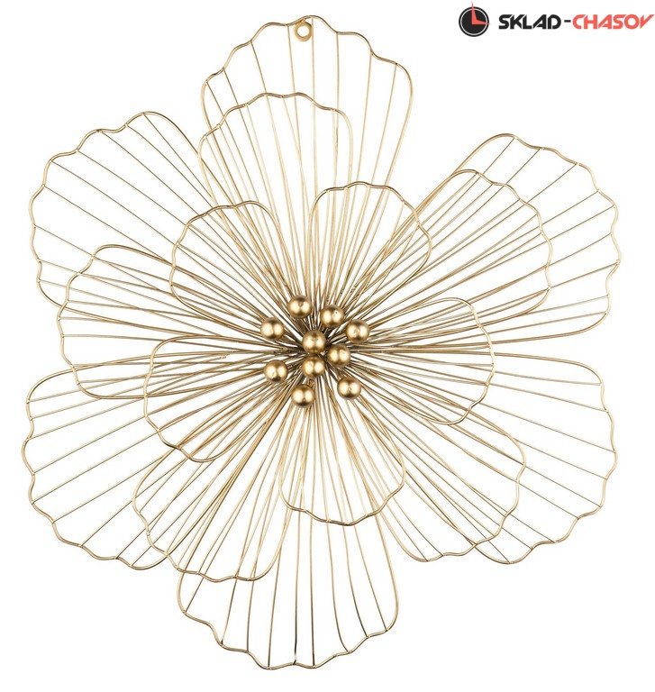 Объемное настенное панно изготовлено из металла с золотистым покрытием. Лепестки из тонких прутьев расположены на разных уровнях Размеры 53 x 56 x 10 см
