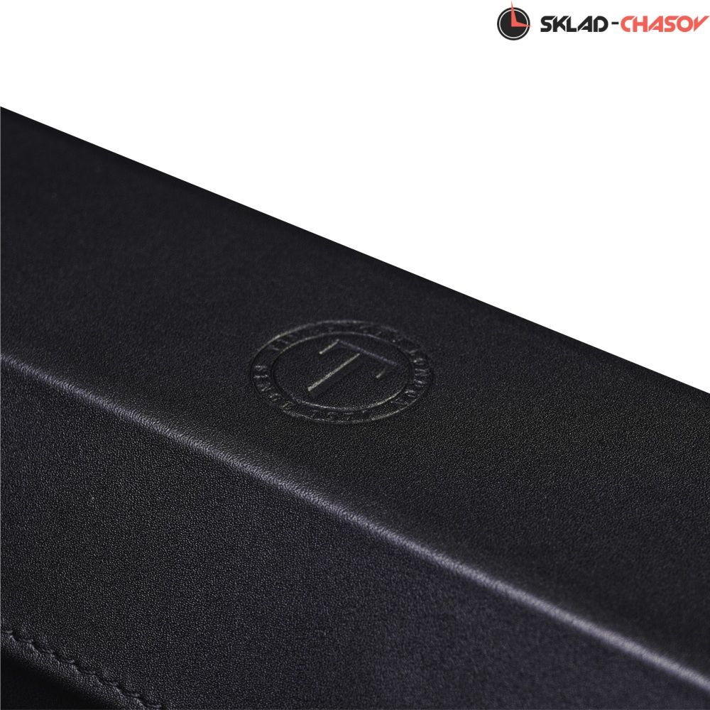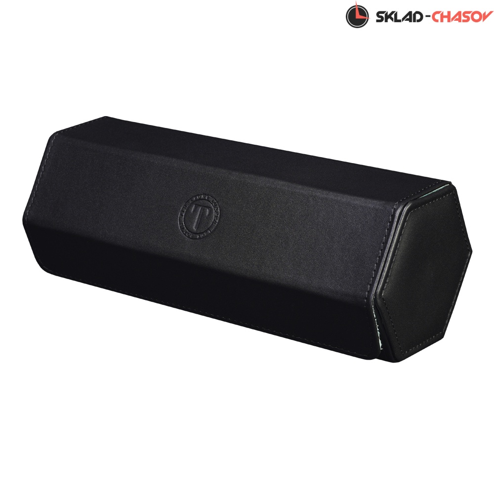 Обивка выполнена из гладкой чёрной экокожи, украшенной фирменным тиснением логотипа. Контрастная внутренняя отделка из мягкого бархата небесно-голубого оттенка надёжно защищает корпус часов от царапин и повреждений.