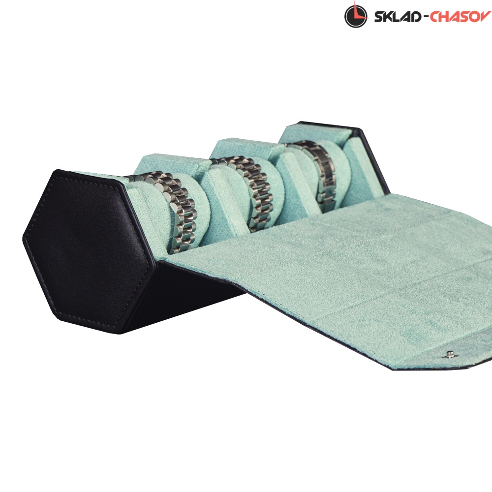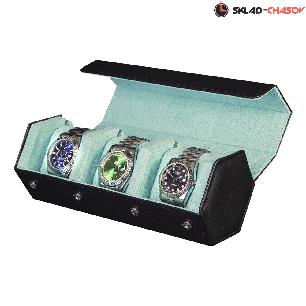 Футляр рассчитан на 3 наручных часов, каждое отделение оснащено съёмной подушечкой. Жёсткий корпус обеспечивает устойчивость и защиту при перевозке, а крышка с кнопками-клёпками прочно фиксируется.