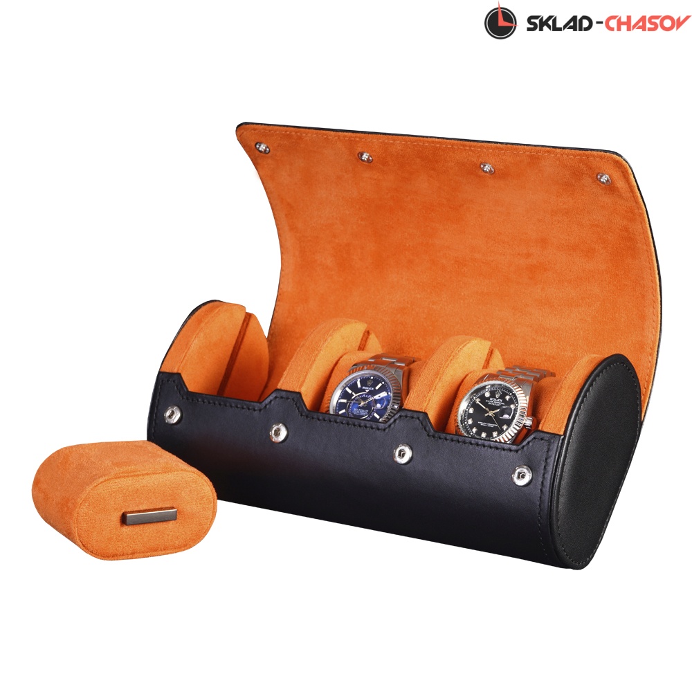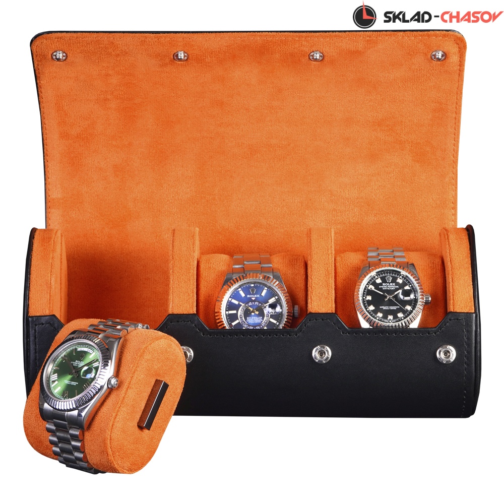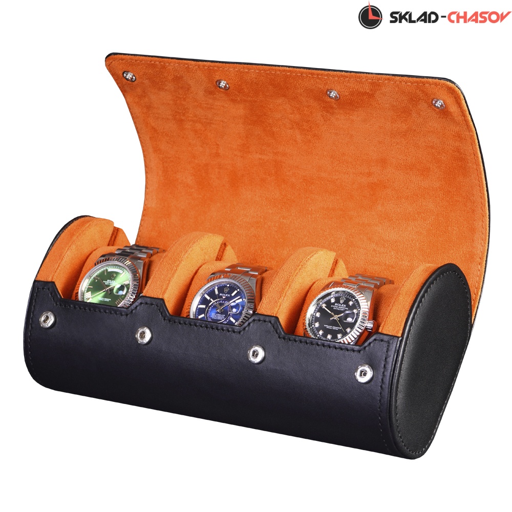 Футляр рассчитан на 3 модели часов, каждая из которых размещается на съёмной подушечке, подходящей для любых размеров браслетов. Жёсткий каркас и прочные кнопки-клепки гарантируют надёжную фиксацию крышки и защиту содержимого от ударов и тряски.