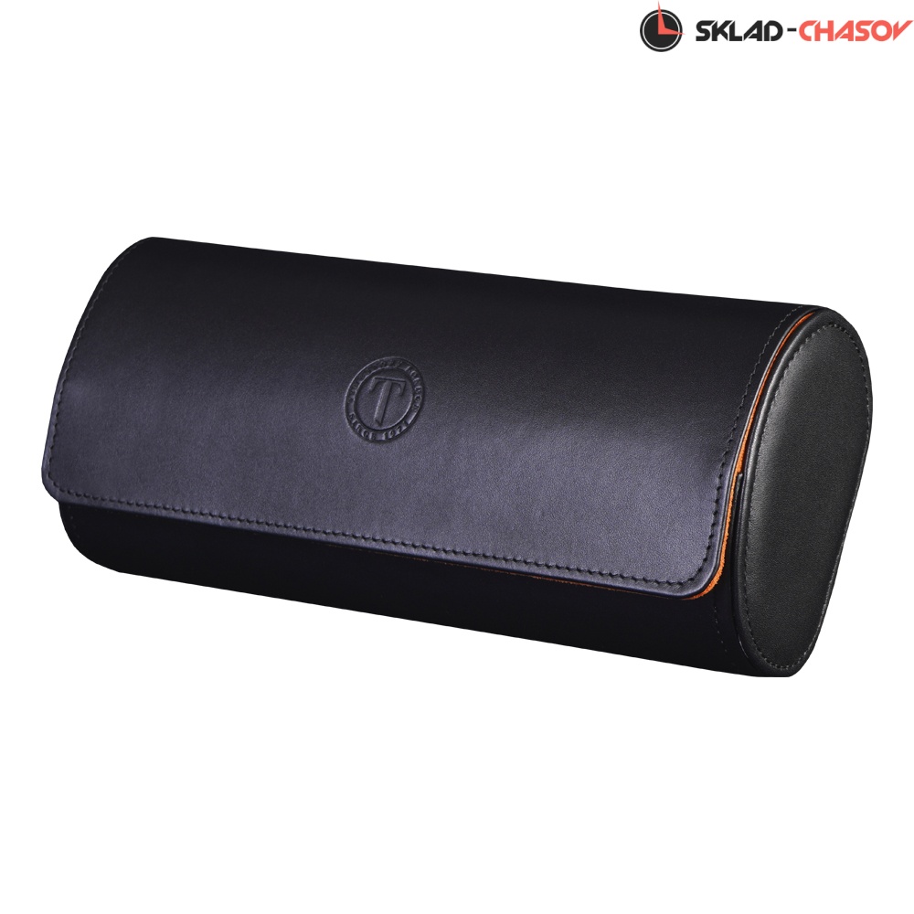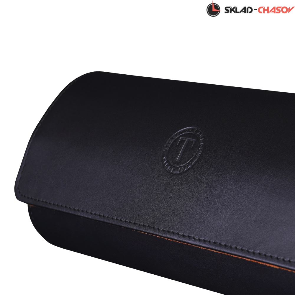 Внешняя часть выполнена из гладкой чёрной экокожи с фирменным тиснением на крышке, подчеркивающим стиль бренда. Внутренняя отделка из мягкого ярко-оранжевого велюра создаёт контрастный и эффектный образ и обеспечивает бережную защиту для часов.