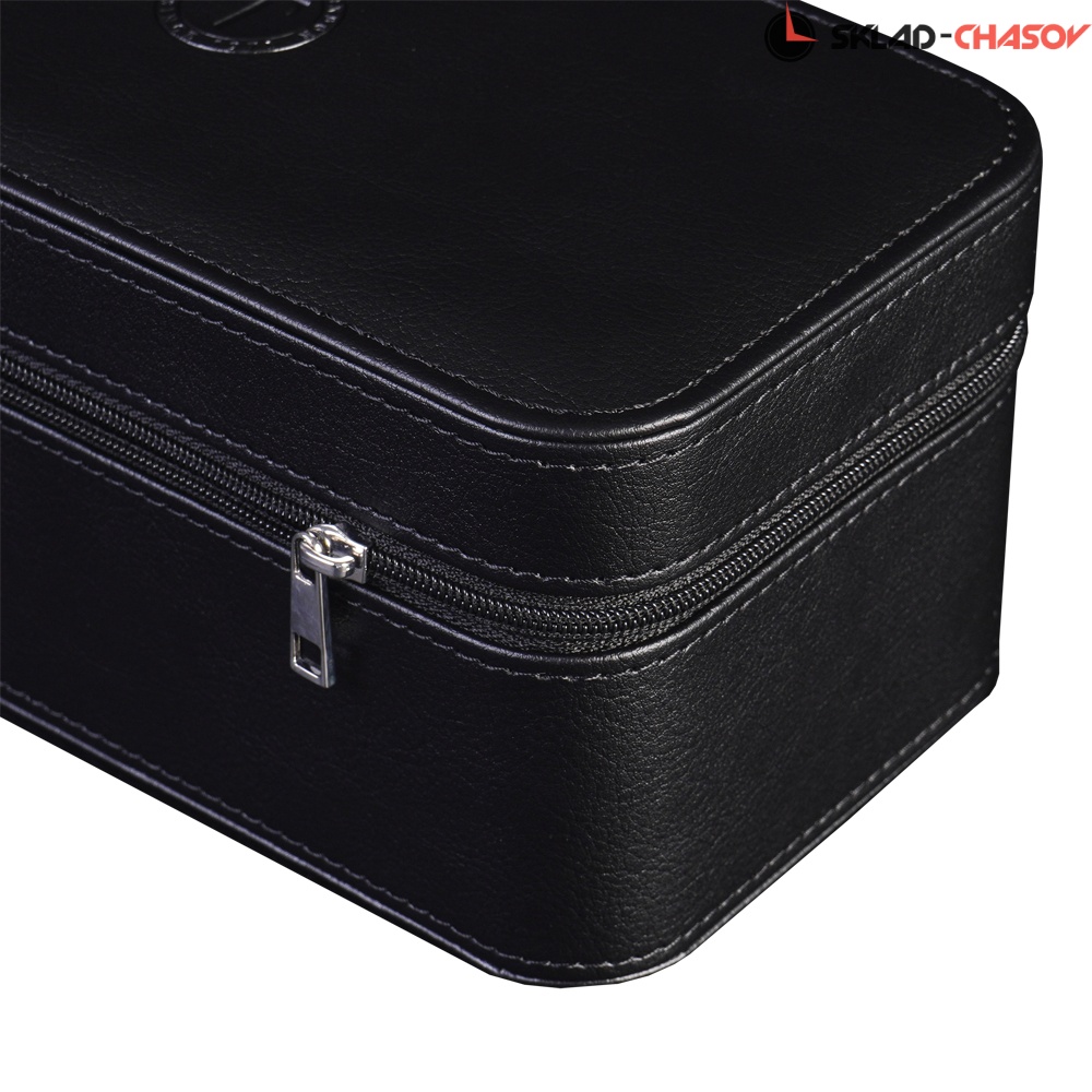 Изготовлен из чёрной кожи с аккуратной белой строчкой и снабжён молнией по периметру, что обеспечивает надёжную защиту содержимого. Внутренняя часть выполнена из мягкого чёрного велюра, подушечки прочно удерживают часы на месте. Молния по периметру закрывает футляр плотно и надёжно, защищая содержимое от влаги, пыли и случайных повреждений. Прочный корпус и минималистичный дизайн делают этот футляр незаменимым аксессуаром для поездок и повседневного хранения.