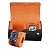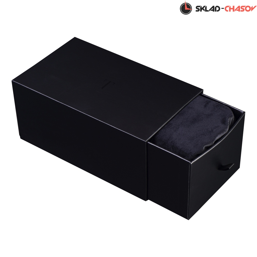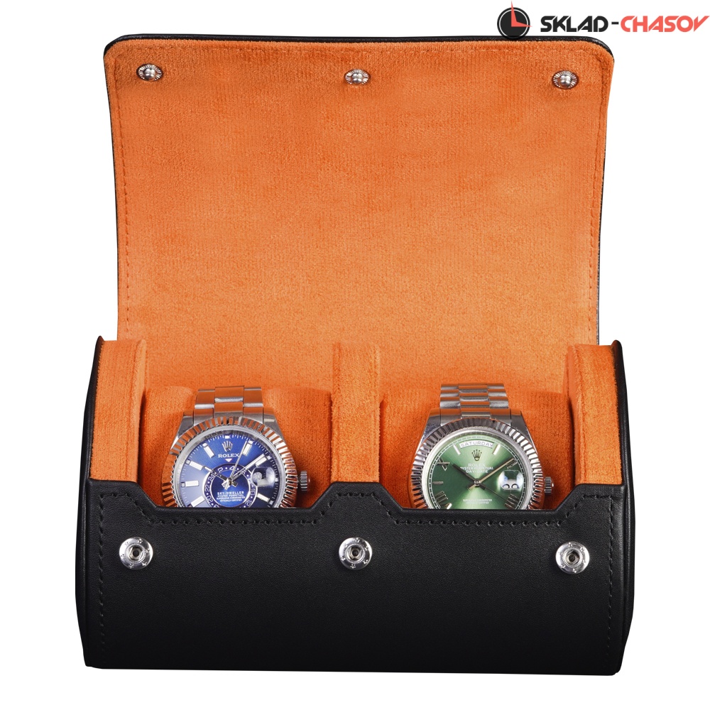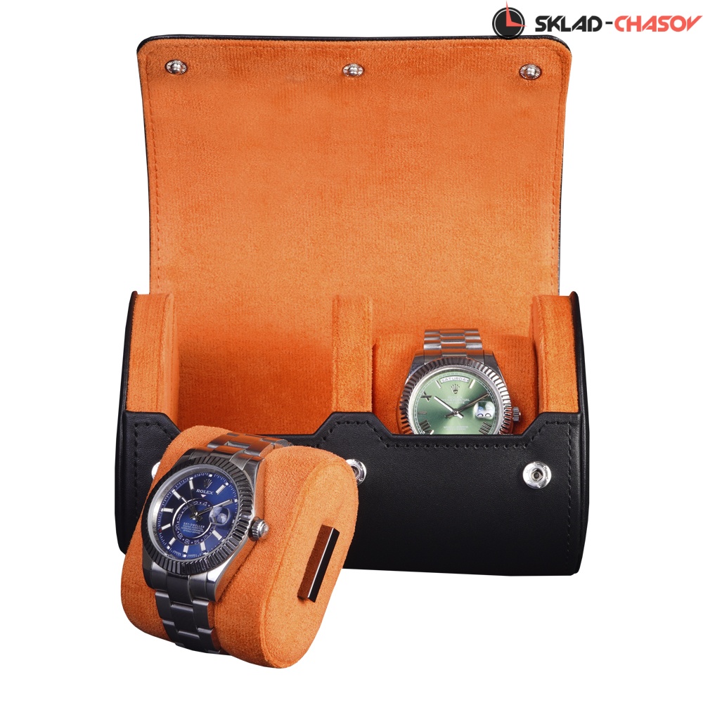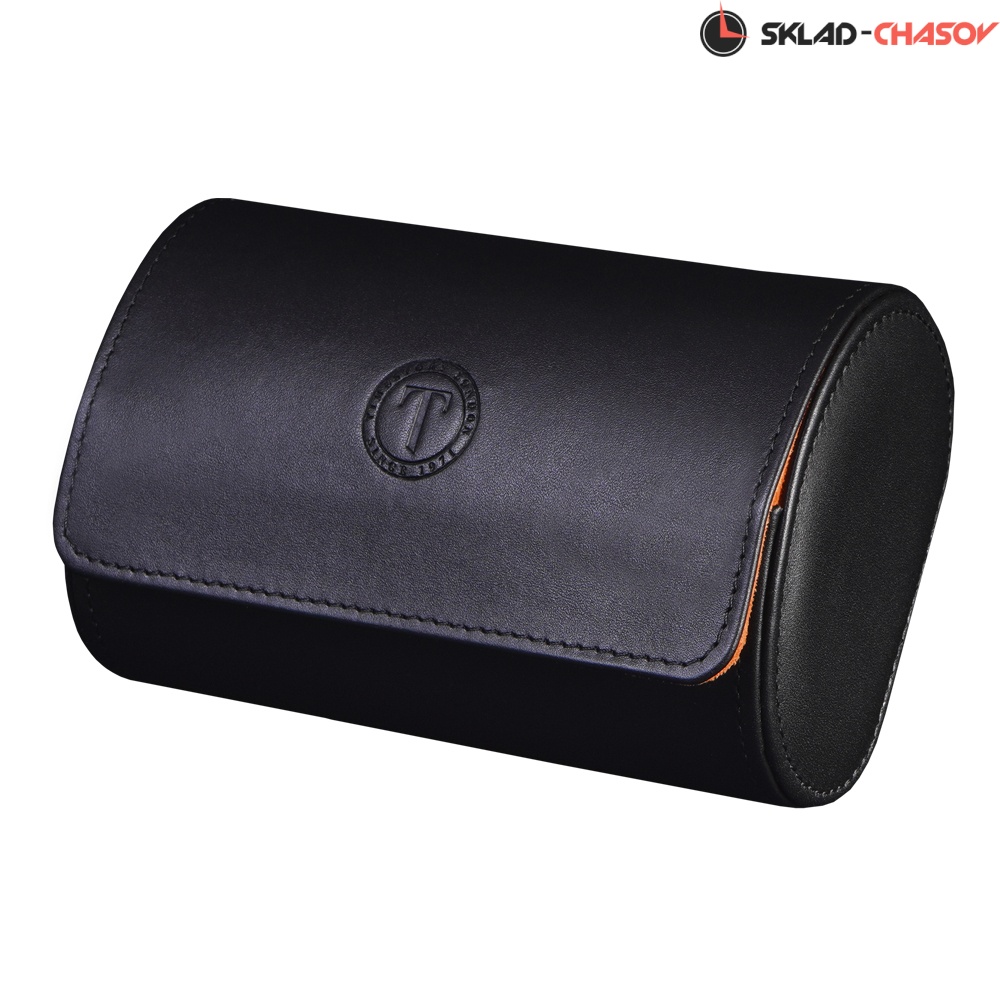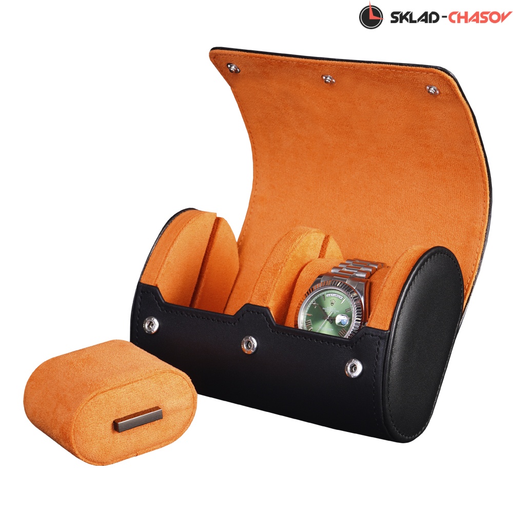Внешняя часть выполнена из гладкой чёрной экокожи с фирменным тиснением на крышке, подчеркивающим стиль бренда. Внутренняя отделка из мягкого ярко-оранжевого велюра создаёт контрастный и эффектный образ и обеспечивает бережную защиту для часов.