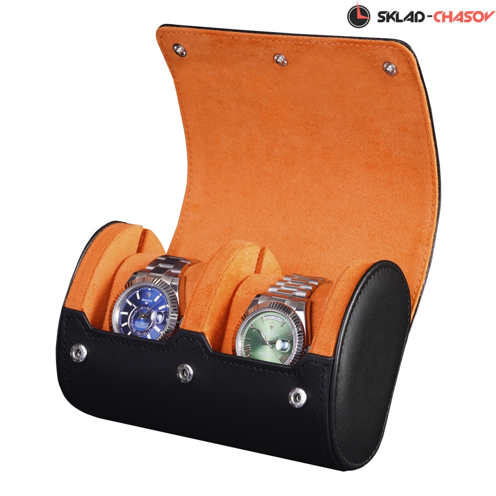Футляр рассчитан на две модели часов, каждая из которых размещается на съёмной подушечке, подходящей для любых размеров браслетов. Жёсткий каркас и прочные кнопки-клепки гарантируют надёжную фиксацию крышки и защиту содержимого от ударов и тряски.