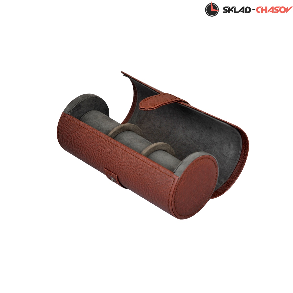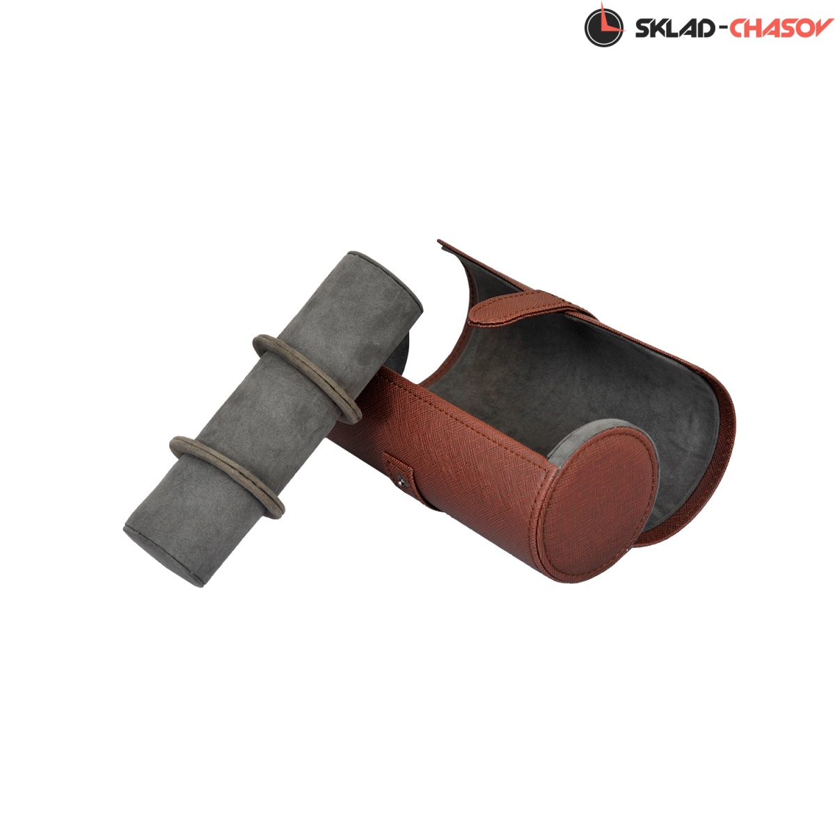 Невероятно удобный, цилиндрической формы футляр предназначен для перевозки 3-4 часов. Классический экстерьер, выполненный из тиснения коричневой кожи, добавляет изящность, а его износостойкость необыкновенно высока. В дополнении к элегантности черный корпус переходит в приятный бархатный интерьер серого оттенка. Удобный внутренний валик позволит с максимальным удобством расположить часы любых размеров.