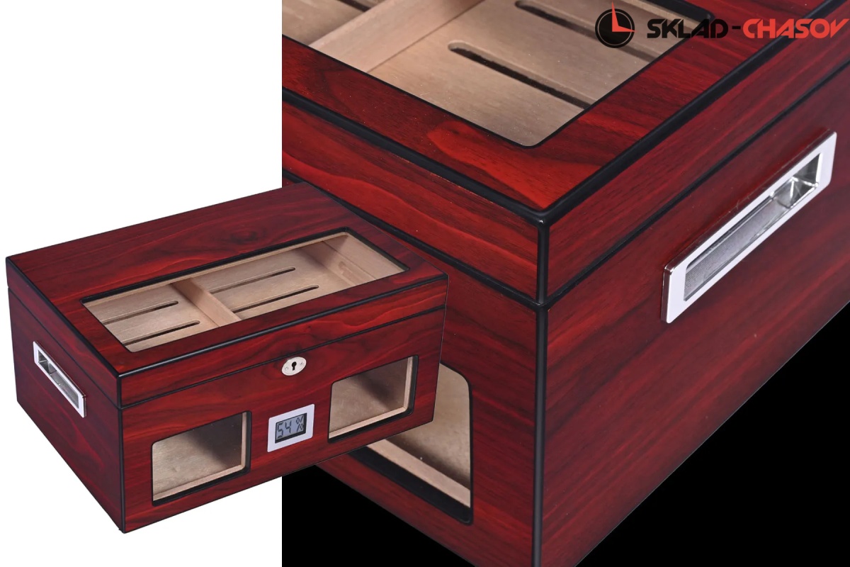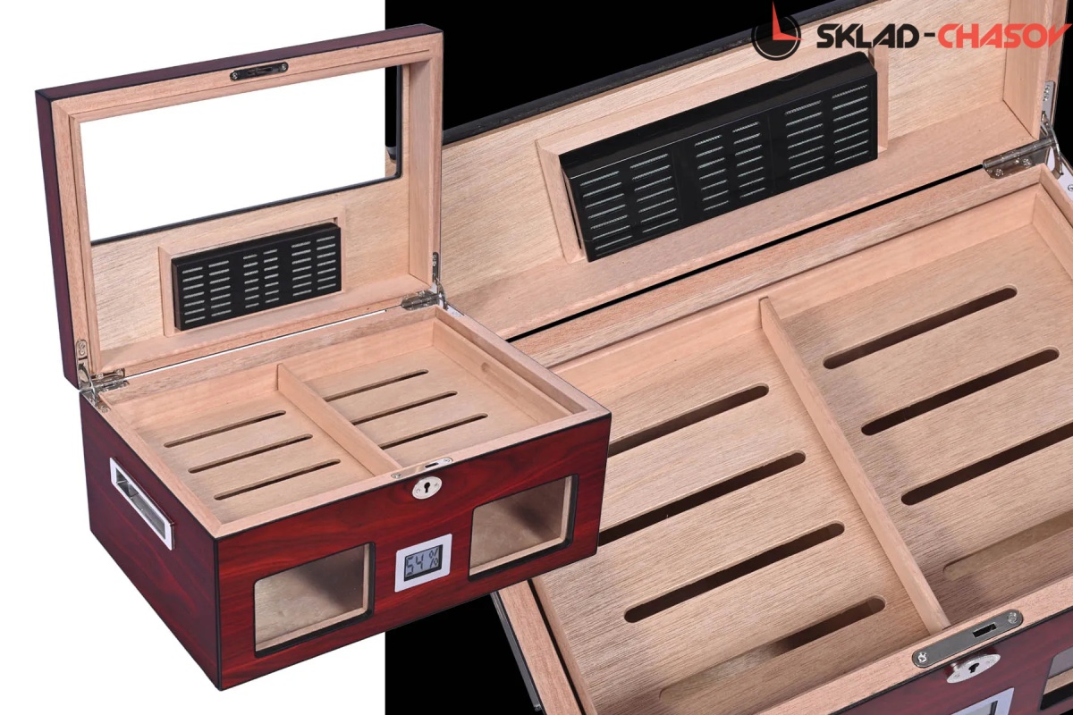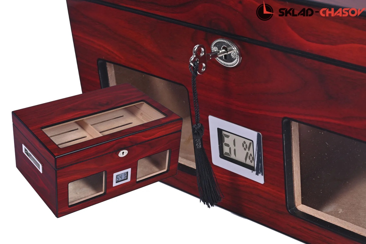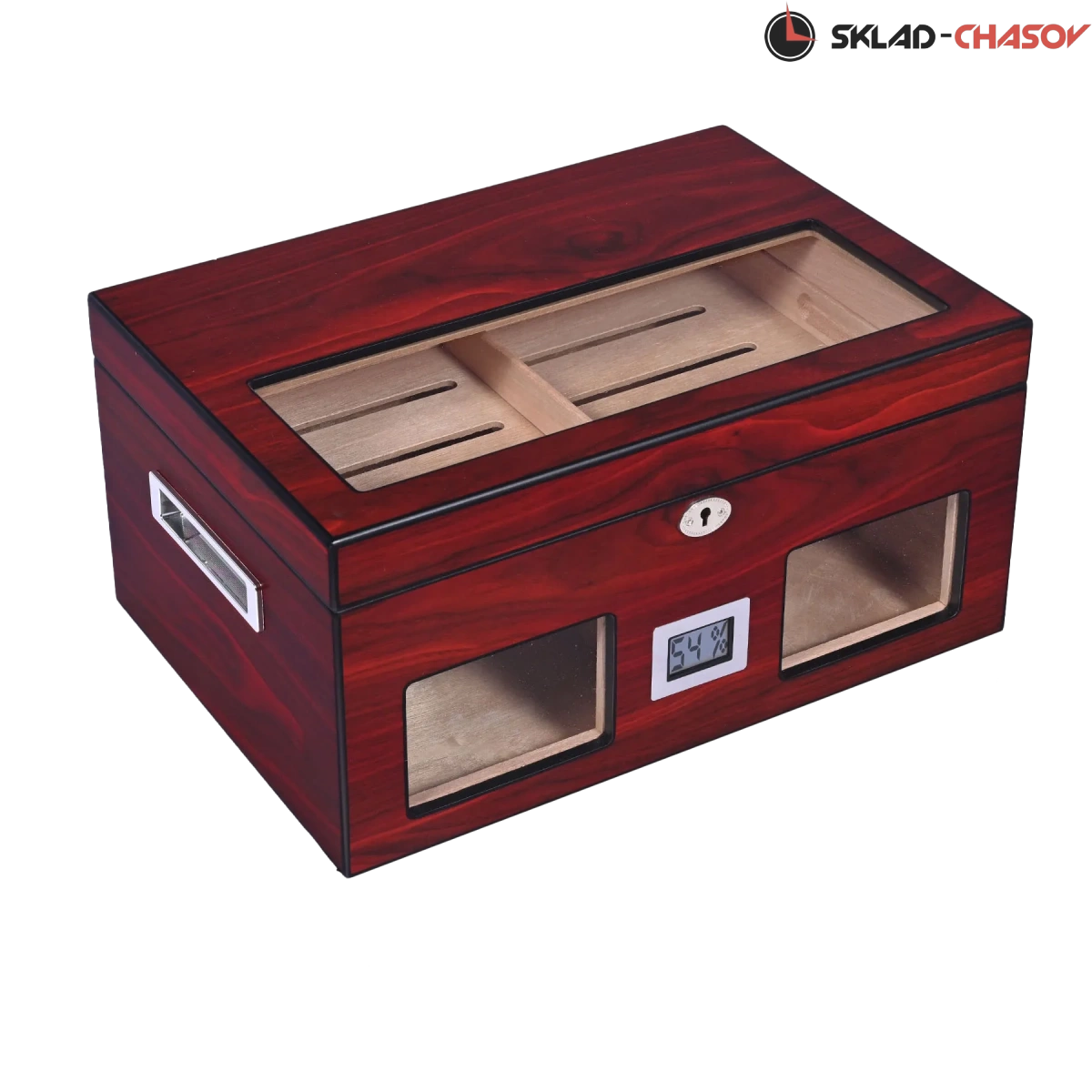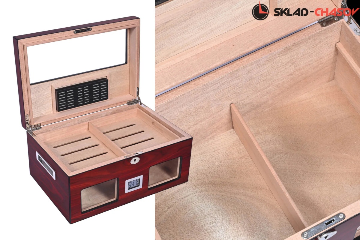 Хьюмидор для полноценного хранения ориентировочно 70 сигар, двойное дно. Коричневое дерево маккасар, в комплекте увлажнитель - новинка (цифровой).