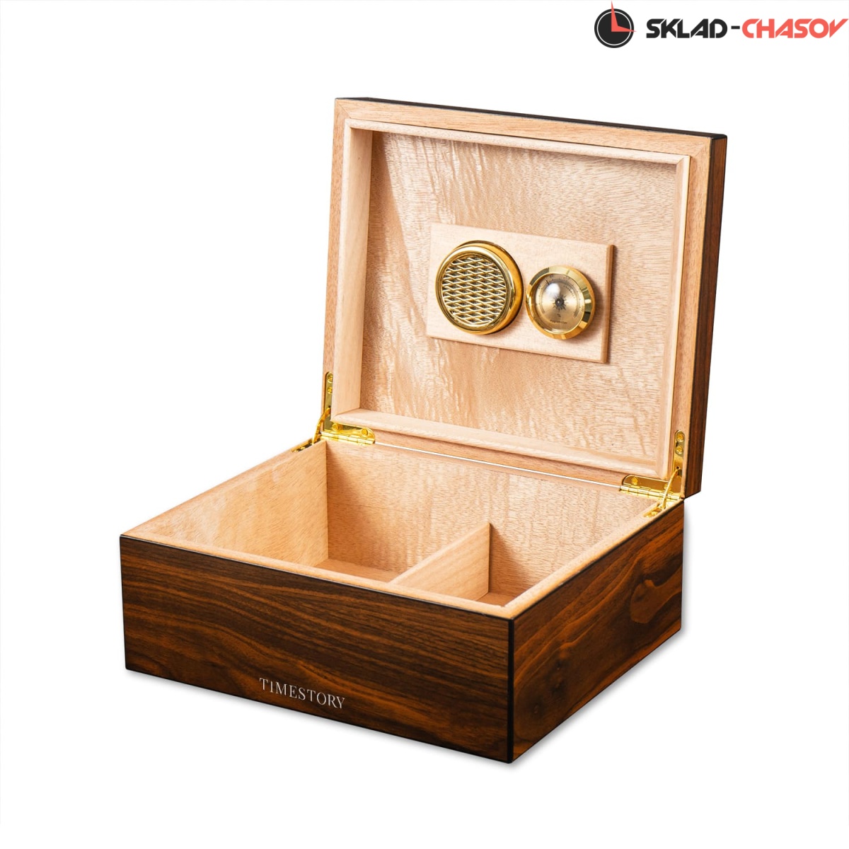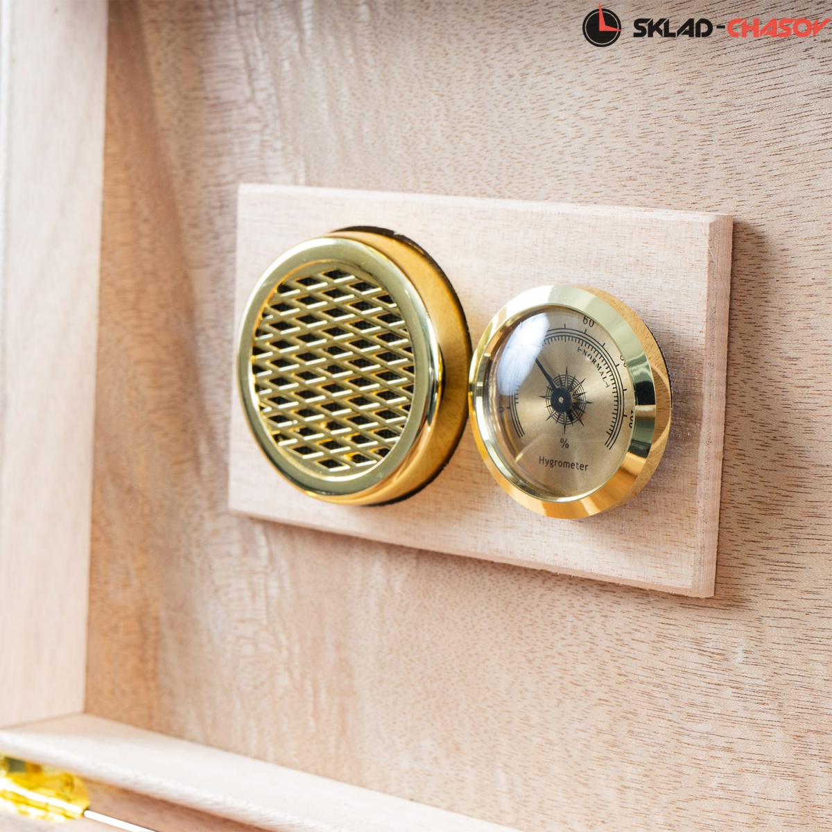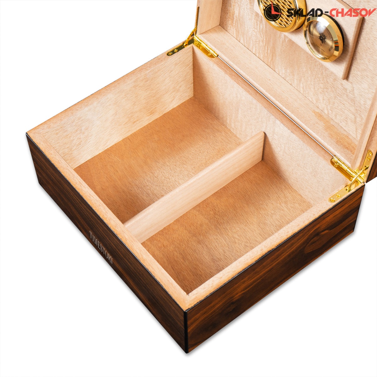 Для настоящих ценителей сигар хьюмидор оборудован высокоточным аналоговым гигрометром и увлажнителем. Сигары бывают разных размеров и поэтому в нижней секции есть передвижная стенка. Демонстрируя свою коллекцию через крышку, нужно не забывать про ее сохранность. Обеспечить ее позволяет небольшой замочек на торцевой части, закрывающийся на ключ.