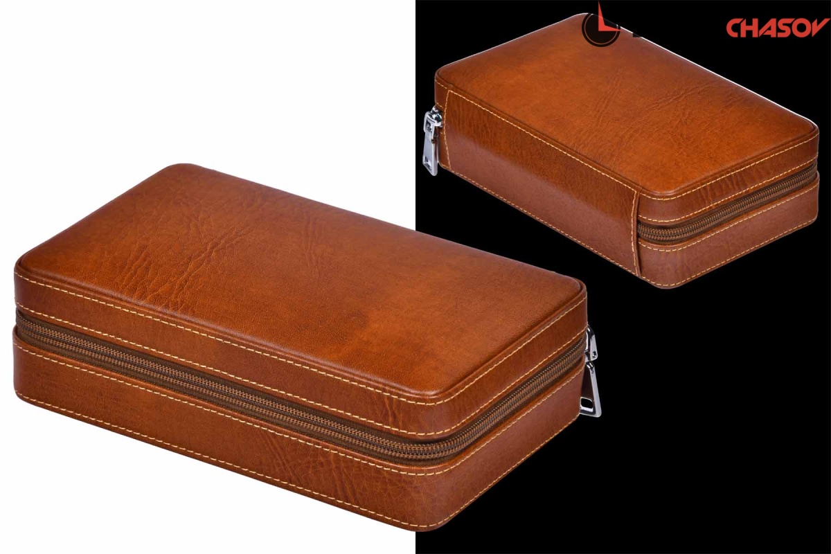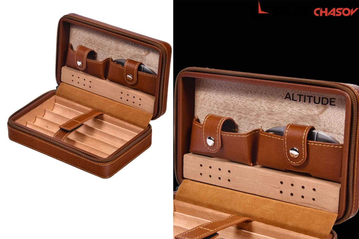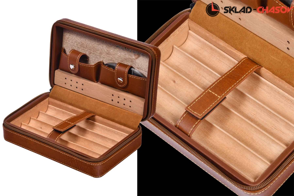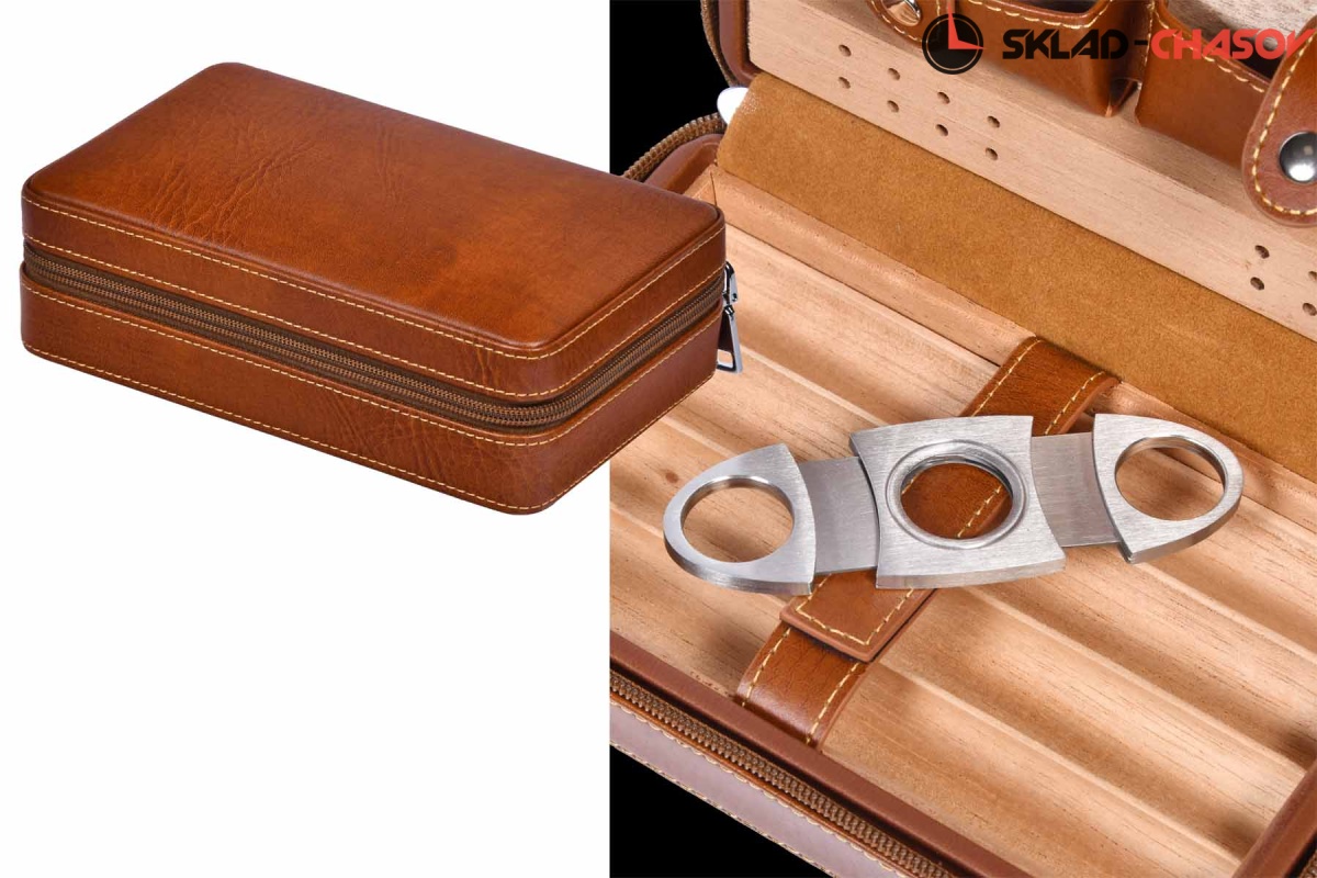 Переносной хьюмидор для 4 сигар, в комплекте гильотина. Корпус из эко кожи коричневого цвета, внутри отделка деревом и доп. отделения.