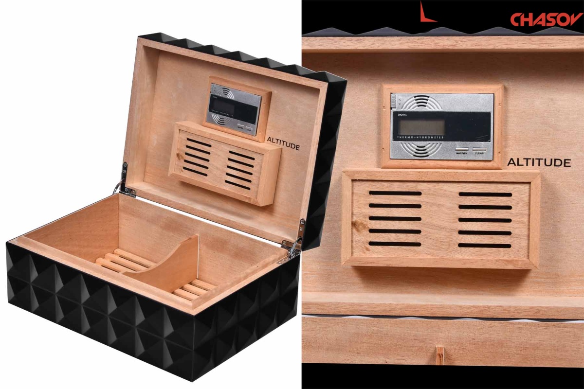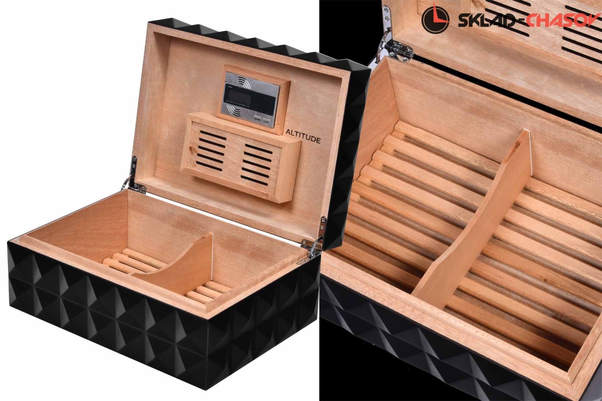 Дизайнерский корпус из чёрного дерева венге ромбовой формы не оставляет равнодушным. Цельное дерево, внутри датчик и электронное табло. Предназначен для 50-100 сигар. Идеальный вариант для подарка или личного использования.
