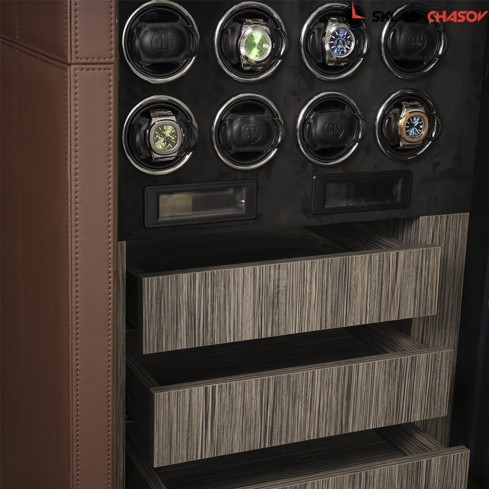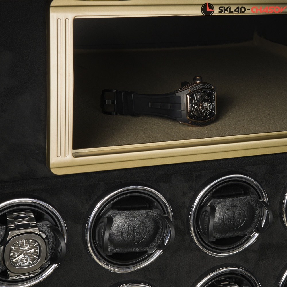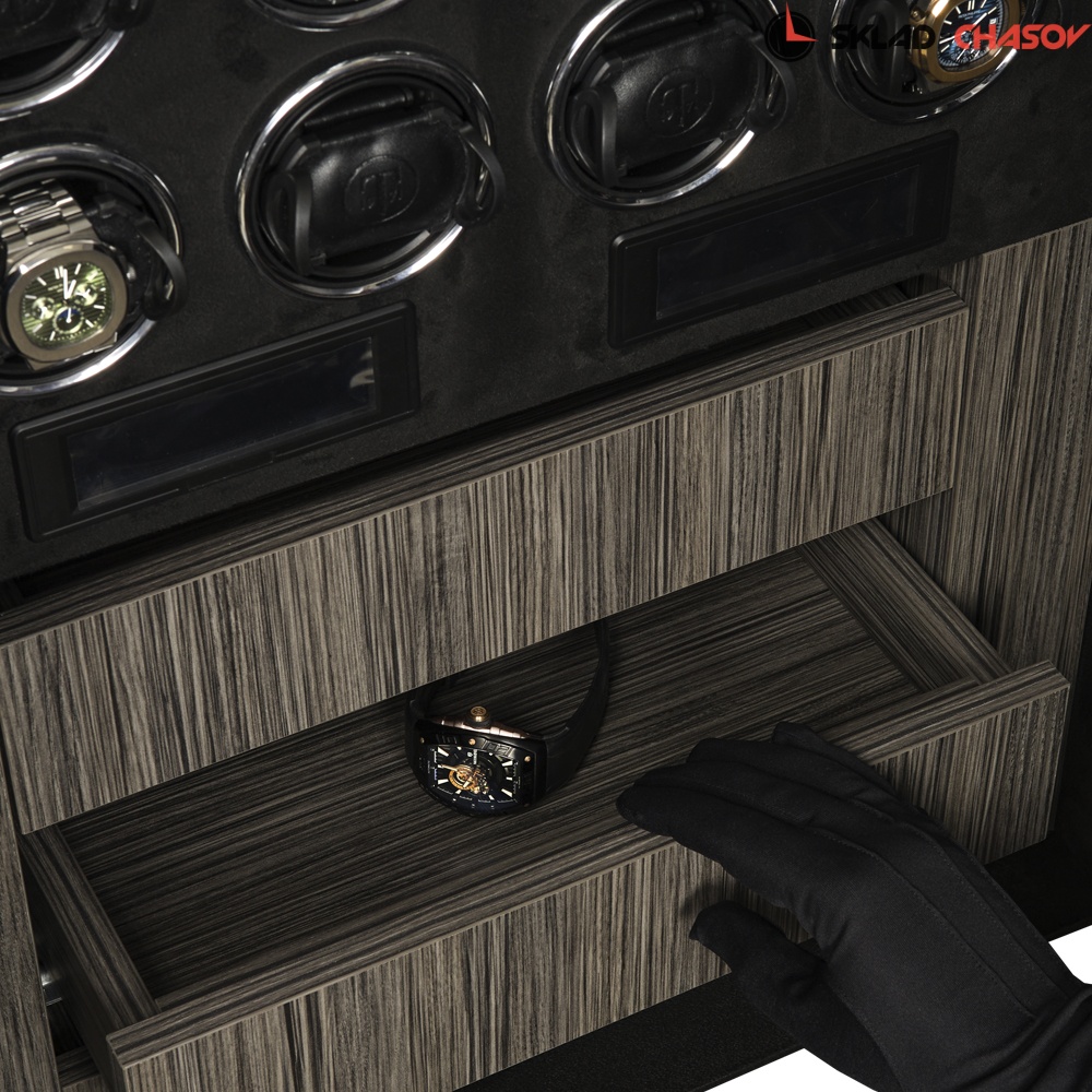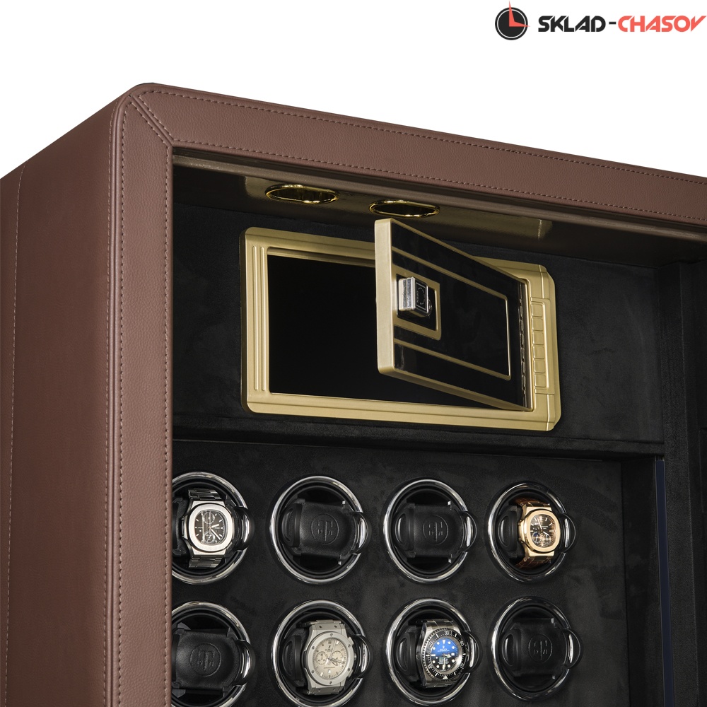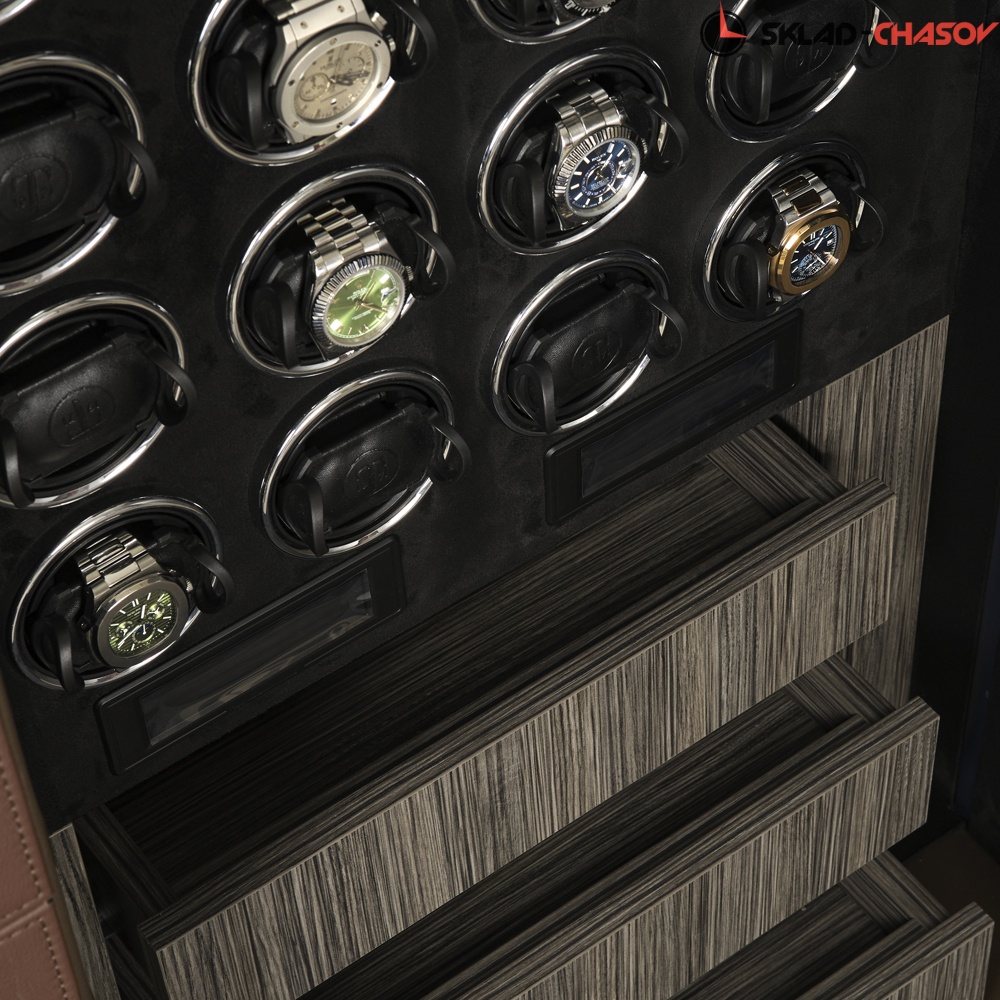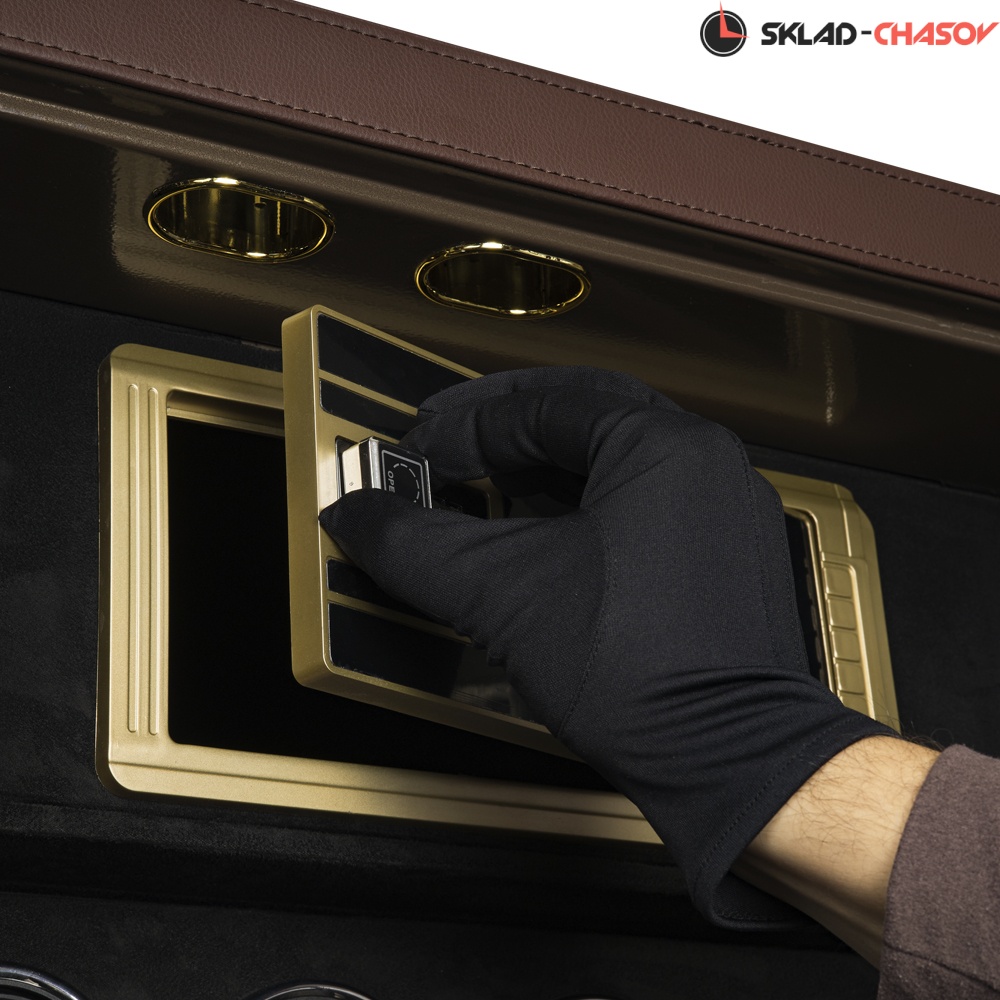 Для настоящих ценителей своих часов, внутри сейфа предусмотрен автоподзавод 16-ти часов, который включается всего с одной кнопки на сенсорной консоли. Профессиональная система выбора режимов вращения сможет завести любые часы любой сложности. Достаточно просто на сенсорном экране подобрать нужное количество оборотов (от 650 до 1950), выбрать подходящее вращение (по часовой / против часовой стрелки или попеременное вращение) и часы будут автоматически подзаводиться. Можно остановить вращение определенных часов в шкатулке для удобного извлечения их из ячейки.