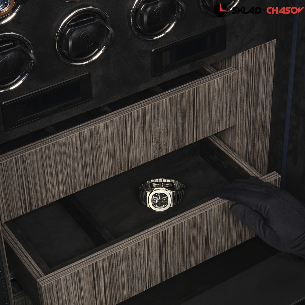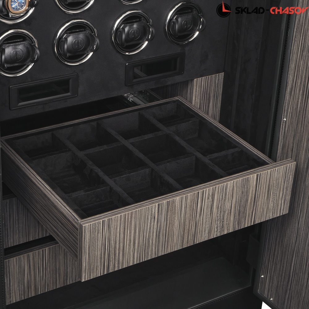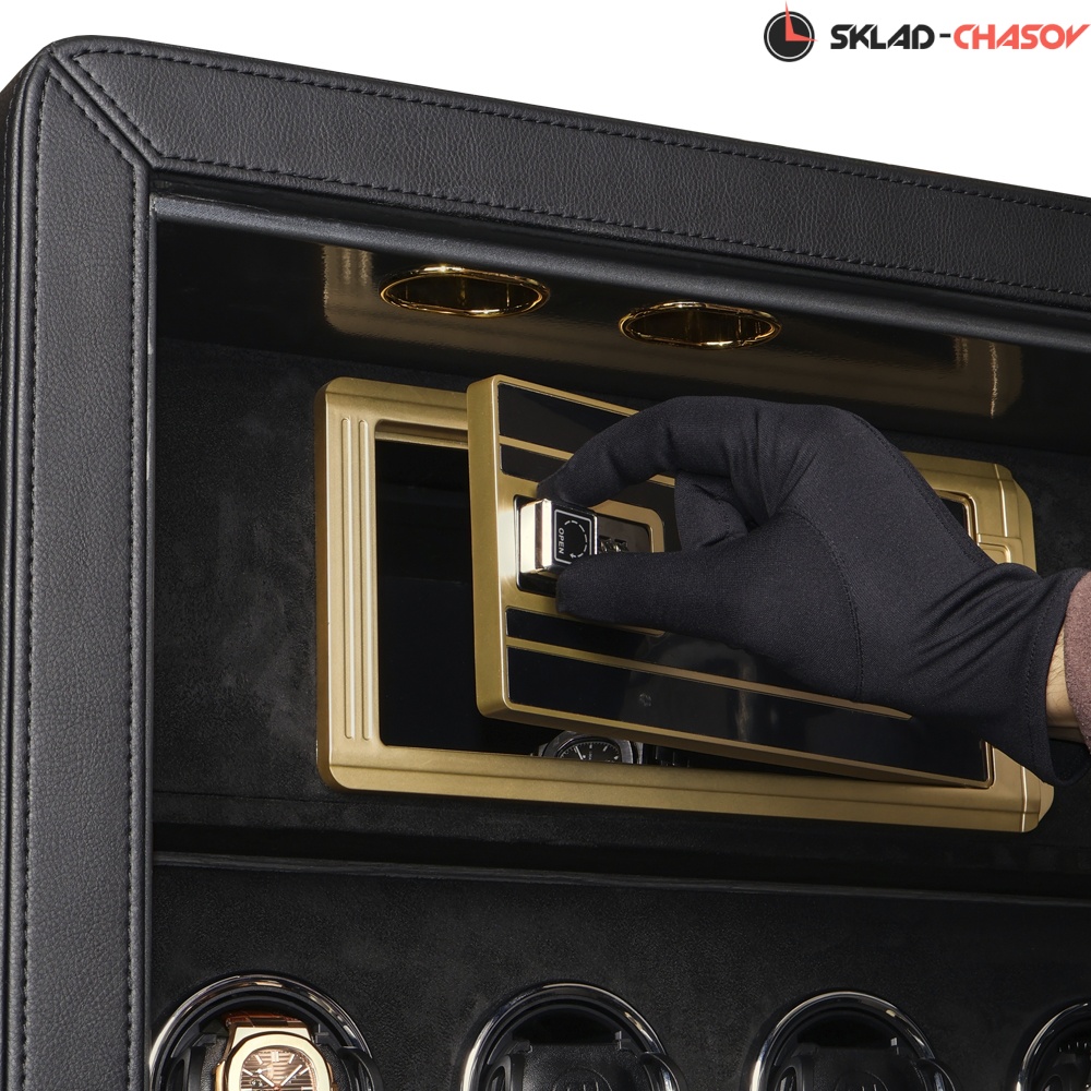 Для настоящих ценителей своих часов, внутри сейфа предусмотрен автоподзавод 24-х часов, который включается всего с одной кнопки на сенсорной консоли. Профессиональная система выбора режимов вращения сможет завести любые часы любой сложности. Достаточно просто на сенсорном экране подобрать нужное количество оборотов (от 650 до 1950), выбрать подходящее вращение (по часовой / против часовой стрелки или попеременное вращение) и часы будут автоматически подзаводиться. Можно остановить вращение определенных часов в шкатулке для удобного извлечения их из ячейки.