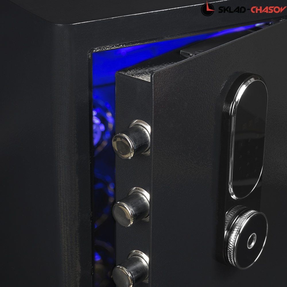 Для ночной видимости часов, в сейфе встроена приятная синяя светодиодная подсветка, включающаяся с сенсорной кнопки на дисплее.
