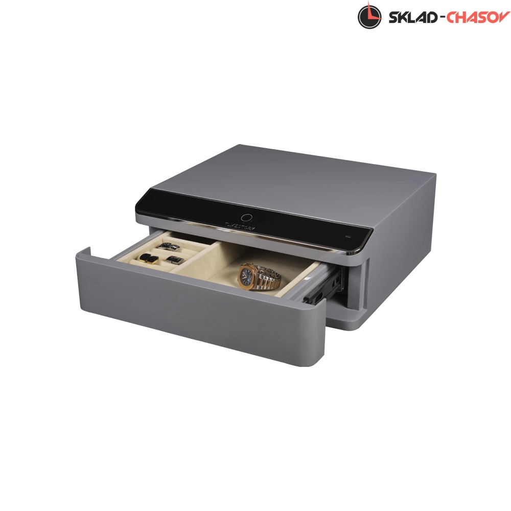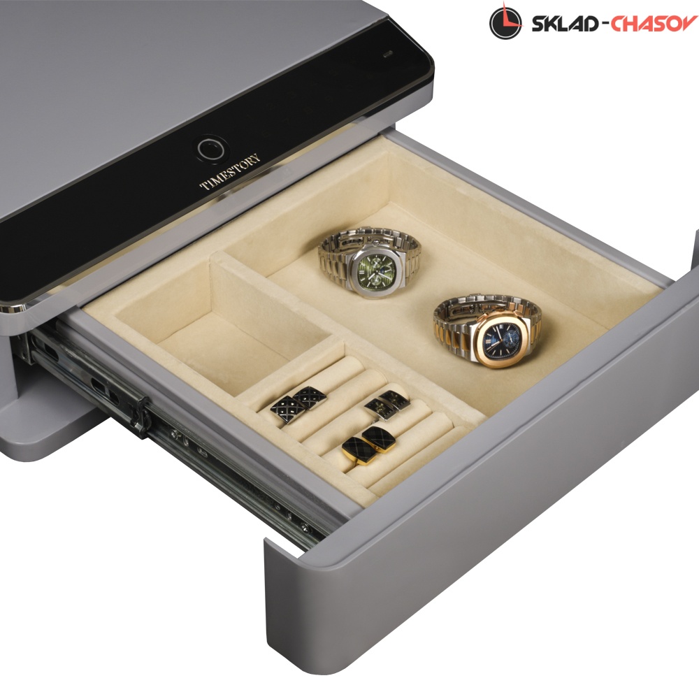 Сейф был продуман до мелочей. Шесть мягких полос из бархата были разработаны для хранения колец и серёжек. Одно маленькое отделение и одно большое отделение предназначено для хранения наручных часов или любых драгоценностей.