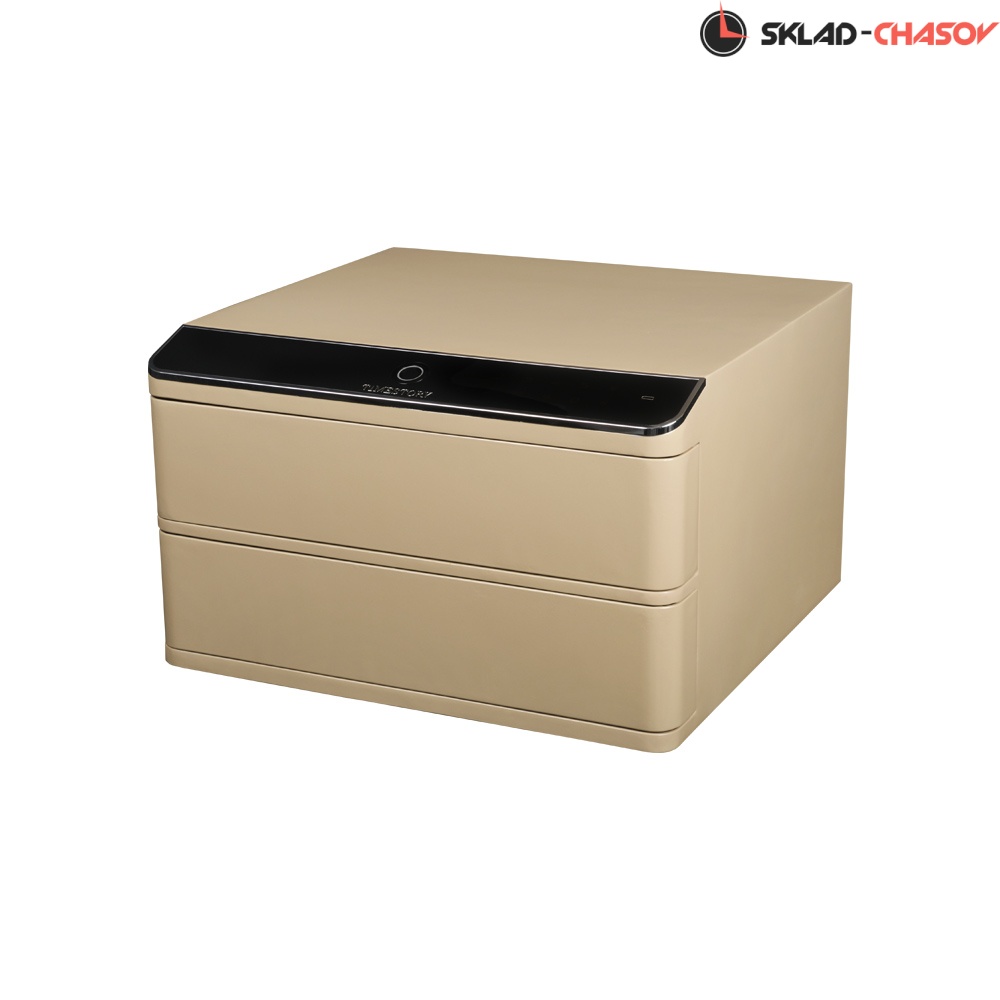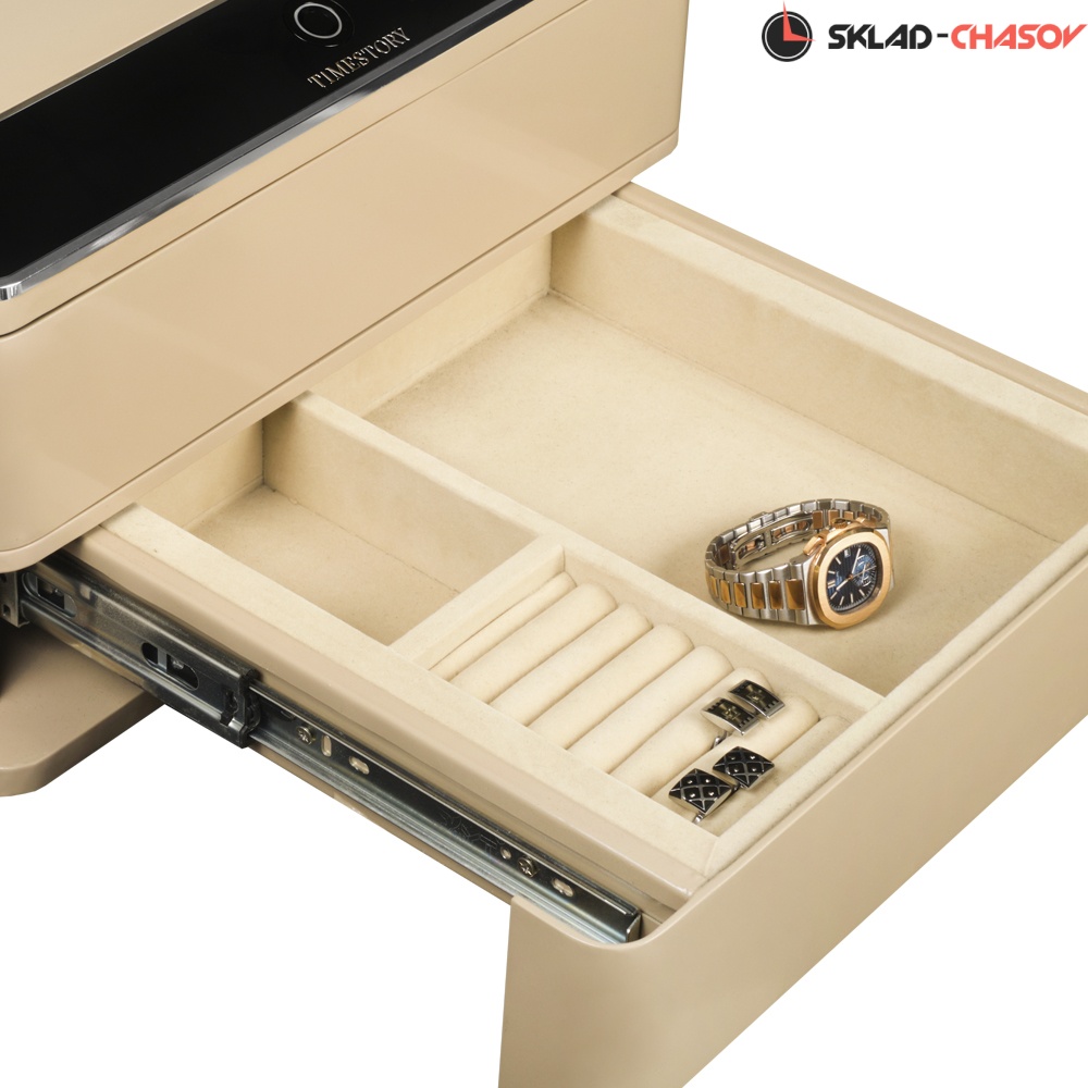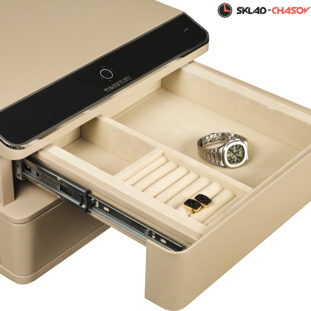 Сейф был продуман до мелочей. Два отдельно открывающихся ящика. В каждом ящике по шесть мягких полос из бархата, которые были разработаны для хранения колец и серёжек. Одно маленькое отделение и одно большое отделение предназначено для хранения наручных часов или любых драгоценностей.