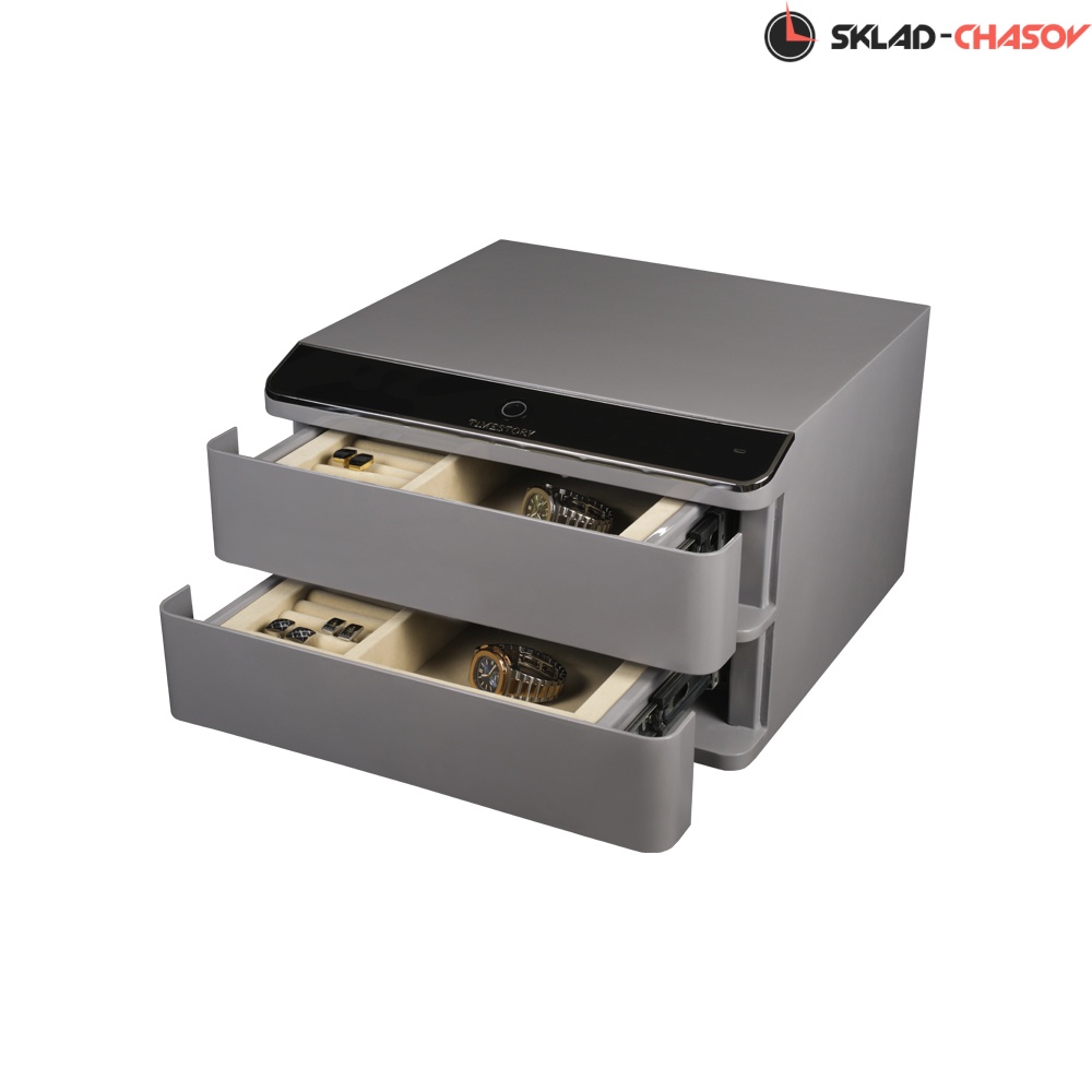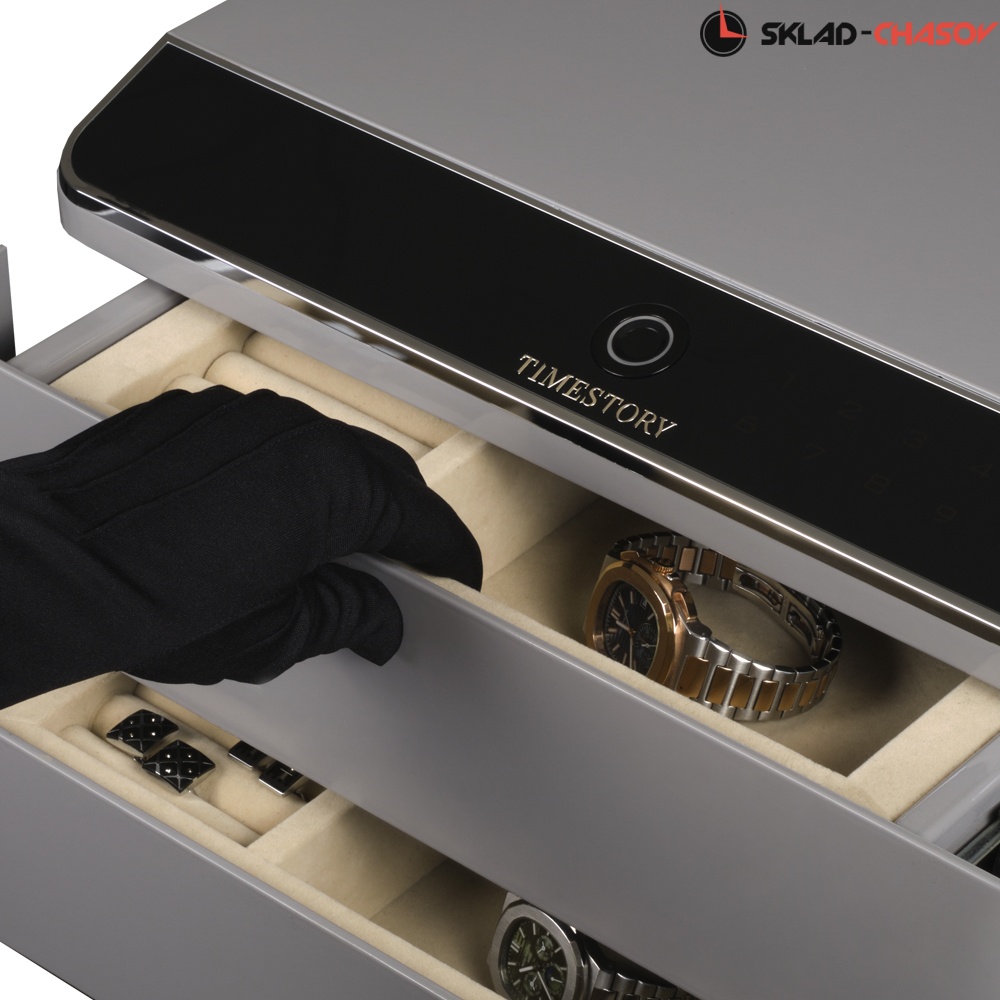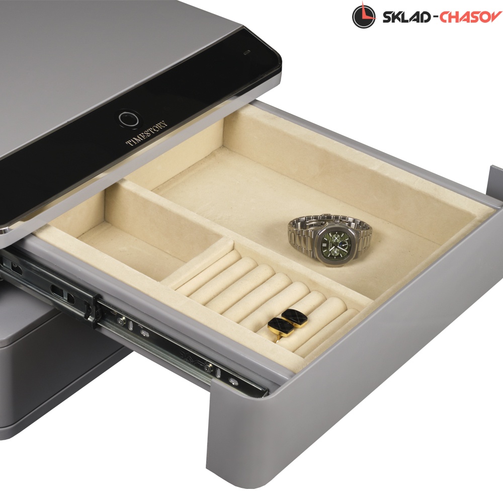 Сейф был продуман до мелочей. Два отдельно открывающихся ящика. В каждом ящике по шесть мягких полос из бархата, которые были разработаны для хранения колец и серёжек. Одно маленькое отделение и одно большое отделение предназначено для хранения наручных часов или любых драгоценностей.