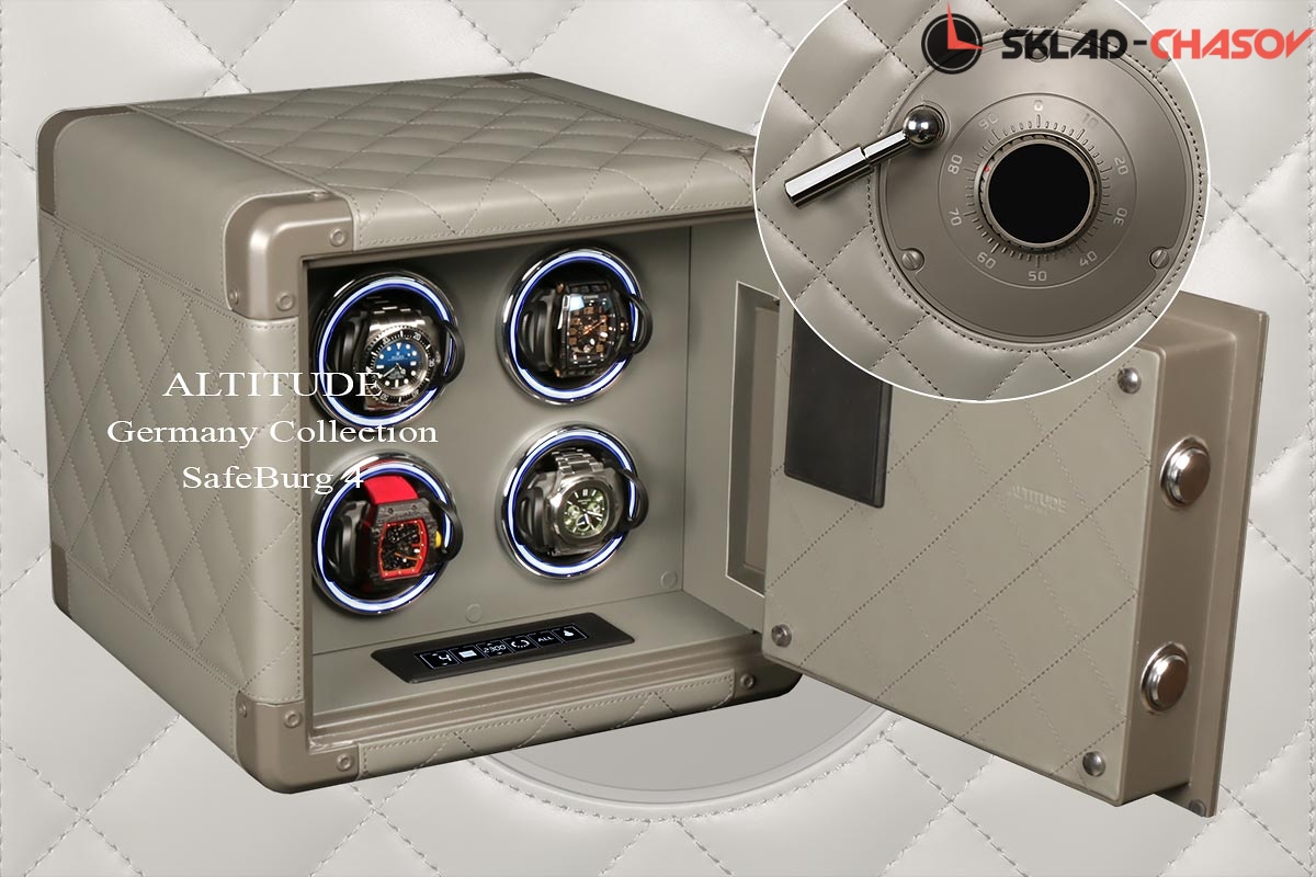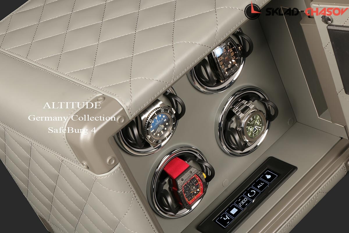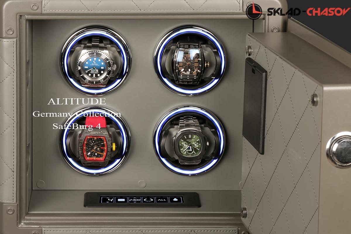 Представляем новую премиальную серию элитных сейфов. Сейф изготовлен из стали, пошит внутри и наружи натуральной кожей серого цвета "наппа", прошит ромбиками в стиле дорогой вариации изготовления, держатели в цветом решении и полностью телескопические, табло тачскрин для любых регулировок позволяет подзаводить любые часы - любой сложности (3 направления вращения, количество оборотов в сутки от 300-2300). Этот сейф прекрасно впишется в дорогой интерьер вашего дома или квартиры. Замок позволяет надежно хранить ваши часы. Есть возможность настройки через программу открытия через смартфон (новинка).