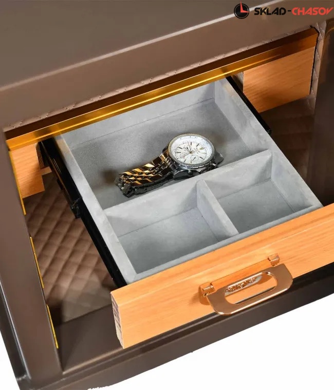 Вдохновившись монументальностью и высокой степенью безопасности крупнейшего художественного музея мира была создана коллекция неприступных сейфов Louvre. Использование самых последний технологий позволило создать максимально взломостойкий сейф c большим местом для хранения. Изготовлен из сверхмощной стали, покрытой специальной износостойкой краской. Для вашего спокойствия и удобства, инновационный сейф Louvre оборудован 3-мя способами открытия: - Сенсорный дисплей с кодом доступа от 3-х до 8-ми цифр - Открытие по отпечатку пальца - Традиционный ключ Возможность открытия сейфа по отпечатку пальца не заставит вас постоянно помнить код, а для открытия достаточно будет только прикосновения вашего пальца. Сейф был продуман до мелочей. Его взломостойкость заслуживает отдельного восхищения. Дверь сейфа закрывается посредством тройных больших штанг с использованием новейших технологий компании TimeStory. Комбинированная замочная система спрятана в муляжных фирменных часах на лицевой стороне сейфа. Дисплей для ввода пароля загорается только после прикосновения к нему, тем самым делая его скрытым от посторонних глаз. Для настоящих ценителей прекрасного, внутри все обшито приятной кожей светло-коричневого оттенка. Удобный ящик посередине выполнен внутри из неповторимого бархата, где вы сможете расположить любимые ювелирные украшения или наручные часы.