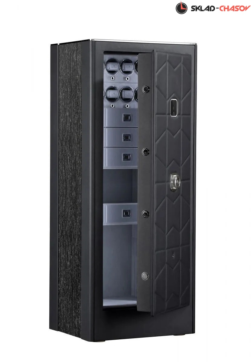 Paul Design Alliance 160 — это воплощение технологической продуманности и эстетического совершенства, созданное для тех, кто стремится к безупречному порядку и изысканному стилю в хранении своей часовой коллекции. Сейф разрабатывается индивидуально под требования клиента, предлагая максимум возможностей как снаружи, так и внутри. Корпус обтянут натуральной телячьей кожей и украшен боковыми вставками из дерева, покрытого высокоглянцевым рояльным лаком, а фурнитура из шлифованного металла подчёркивает статусность и строгость внешнего облика. Пять вариантов цвета (чёрный, серый, синий, бежевый, красный) позволяют гармонично вписать сейф в интерьер любого стиля — от классики до футуризма. Внутреннее пространство продумано до мелочей. Ящики с доводчиками снабжены специальными лотками и вкладышами, позволяющими бережно размещать каждую вещь в отдельном отсеке, обеспечивая не только порядок, но и деликатную защиту. Встроенное LED-освещение, работающее от сети, обеспечивает комфортный доступ ко всем отделениям даже при слабом внешнем освещении. Система замка сочетает в себе современные технологии и удобство: надёжный кодовый замок и биометрический сканер отпечатков пальцев обеспечивают высокий уровень безопасности при быстром доступе к содержимому. Профессиональные автоподзаводы от Paul Design входят в стандартную комплектацию и могут быть расширены: от 4 и более. Количество ящиков — от 1, по вашему запросу. Paul Design Alliance 160 — это не просто сейф, а технологичный и эстетичный объект, призванный подчеркнуть статус владельца и обеспечить идеальные условия хранения для самых ценных вещей.