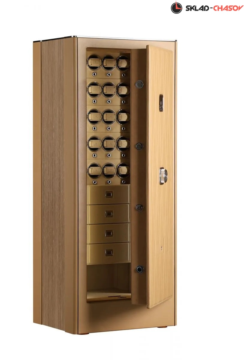 Paul Design Alliance 160 BG — это воплощение технологической продуманности и эстетического совершенства, созданное для тех, кто стремится к безупречному порядку и изысканному стилю в хранении своей часовой коллекции. Корпус обтянут натуральной телячьей бежевой кожей и украшен боковыми вставками из дерева, покрытого высокоглянцевым рояльным лаком, а фурнитура из шлифованного металла подчёркивает статусность и строгость внешнего облика. Непревзойденный дизайн позволяет гармонично вписать сейф в интерьер любого стиля — от классики до футуризма. Внутреннее пространство продумано до мелочей. Четыре ящика снабжены специальными лотками и вкладышами, позволяющими бережно размещать каждую вещь в отдельном отсеке, обеспечивая не только порядок, но и деликатную защиту. Встроенное LED-освещение, работающее от сети, обеспечивает комфортный доступ ко всем отделениям даже при слабом внешнем освещении. Система замка сочетает в себе современные технологии и удобство: надёжный кодовый замок и биометрический сканер отпечатков пальцев обеспечивают высокий уровень безопасности при быстром доступе к содержимому. Бесшумная система автоподзавода 20-ти часов от Paul Design. Количество ящиков и ячеек для автоподзавода можно изменить. Paul Design Alliance 160 BG — это не просто сейф, а технологичный и эстетичный объект, призванный подчеркнуть статус владельца и обеспечить идеальные условия хранения для самых ценных вещей. Толщина двери 11 см. Система "Анти-взлом". "Плавающие" ригели, для обеспечения более высокой взломостойкости. Взломостойкость по VDS, ECB-S 3-й класс. Взломостойкость по ГОСТ 5-й класс.