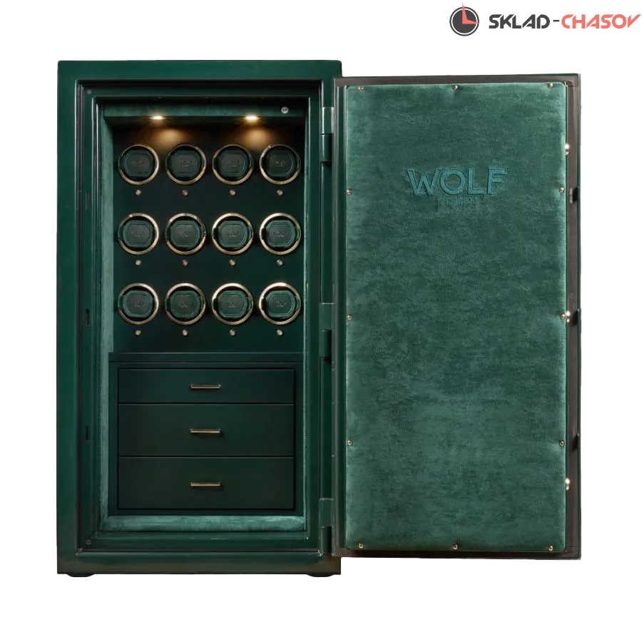 Коллекция Atlas — это воплощение передовых технологий, непревзойдённого стиля и надёжности, достойной лучших часовых и ювелирных коллекций. Фурнитура сейфа выполнена в роскошном золотистом оттенке, гармонично дополняющем глянцевый зелёный корпус. Строгий внешний облик сочетается с продуманным внутренним наполнением. Сейф оснащён 3 выдвижными ящиками: два с разделителями для хранения 5 часов, украшений и аксессуаров, и один открытый — для более крупных предметов. Все они выполнены в фирменной ткани LusterLoc™ насыщенного изумрудного оттенка, которая защищает материал от потемнения на срок до 35 лет. Сейф оборудован системой подзавода для 12 наручных часов, с возможностью индивидуальной настройки оборотов и направления вращения для каждого из них. Продуманный комплект разноразмерных подушек для автоподзавода часов подойдет для установки часов любого диаметра с любой длиной ремешка или браслета. Сейф оснащён надёжным электронным кодовым замком с удобной поворотной ручкой для открытия и запирания дверцы. Абсолютно новая дистанционная система управлением шкатулки поражает воображение. Вам достаточно скачать на ваш смартфон приложение WOLF, и вы сможете на расстоянии от шкатулки настроить подзавод каждых часов / запустить или остановить все ячейки для подзавода. Это мировая новинка, созданная английской компанией. Все сделано с любовью и удобством в пользовании. Важно отметить, что вся продукция премиального бренда изготавливается вручную с использованием экологически чистых материалов. Более того, конструкция огне- и водонепроницаема, что подтверждено независимыми испытаниями. Сертификация UL гарантирует: — огнестойкость при температуре до 927°C в течение 120 минут, с последующим испытанием падением с высоты 9 метров; — во время пожара внутренняя температура не превышает 177°C, что полностью исключает риск возгорания документов (для справки: бумага загорается при 232°C); — противопожарное уплотнение Palusol® расширяется в 8 раз, герметично закрывая дверцу и защищая содержимое от воздействия высоких температур и влаги.