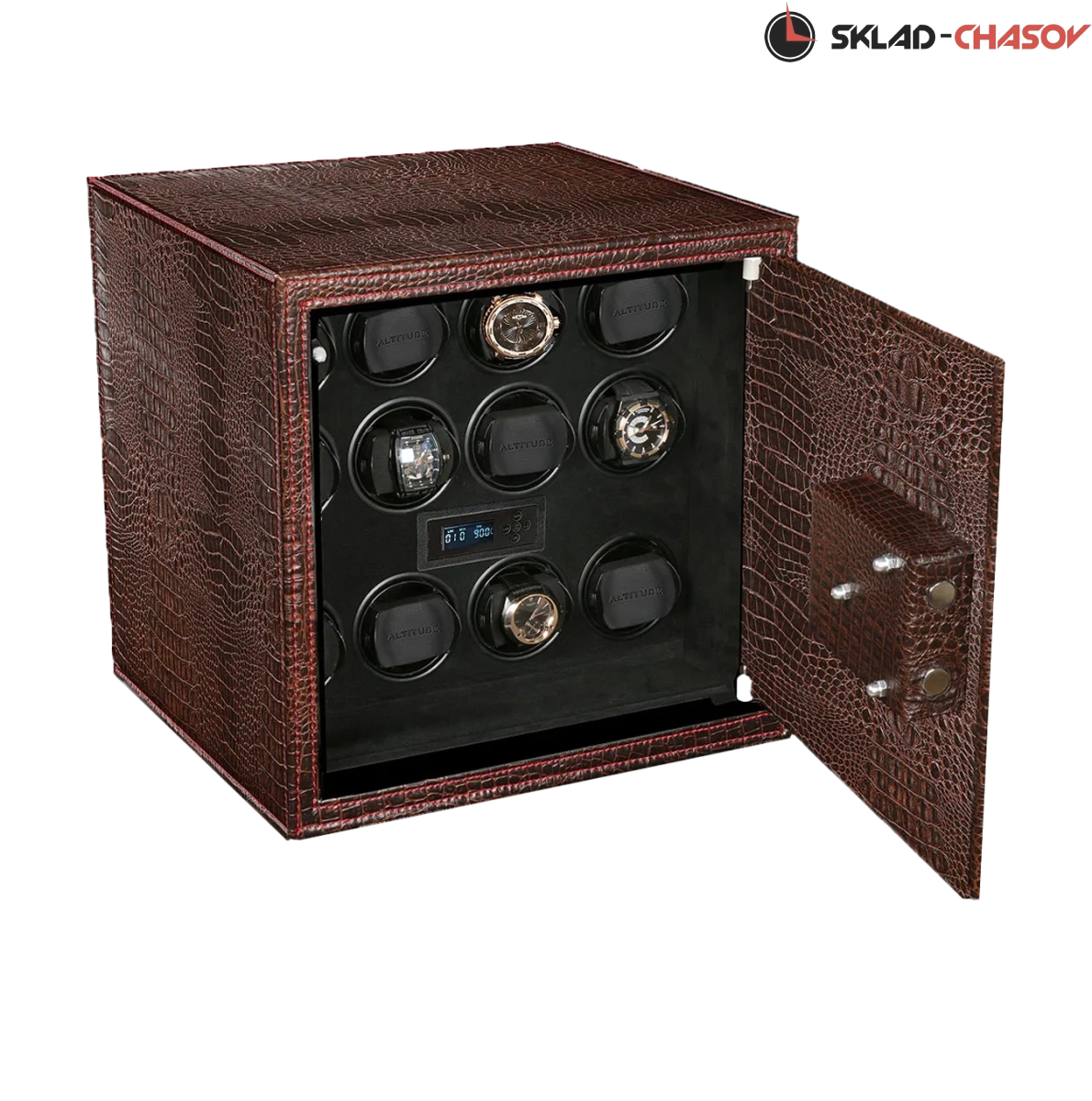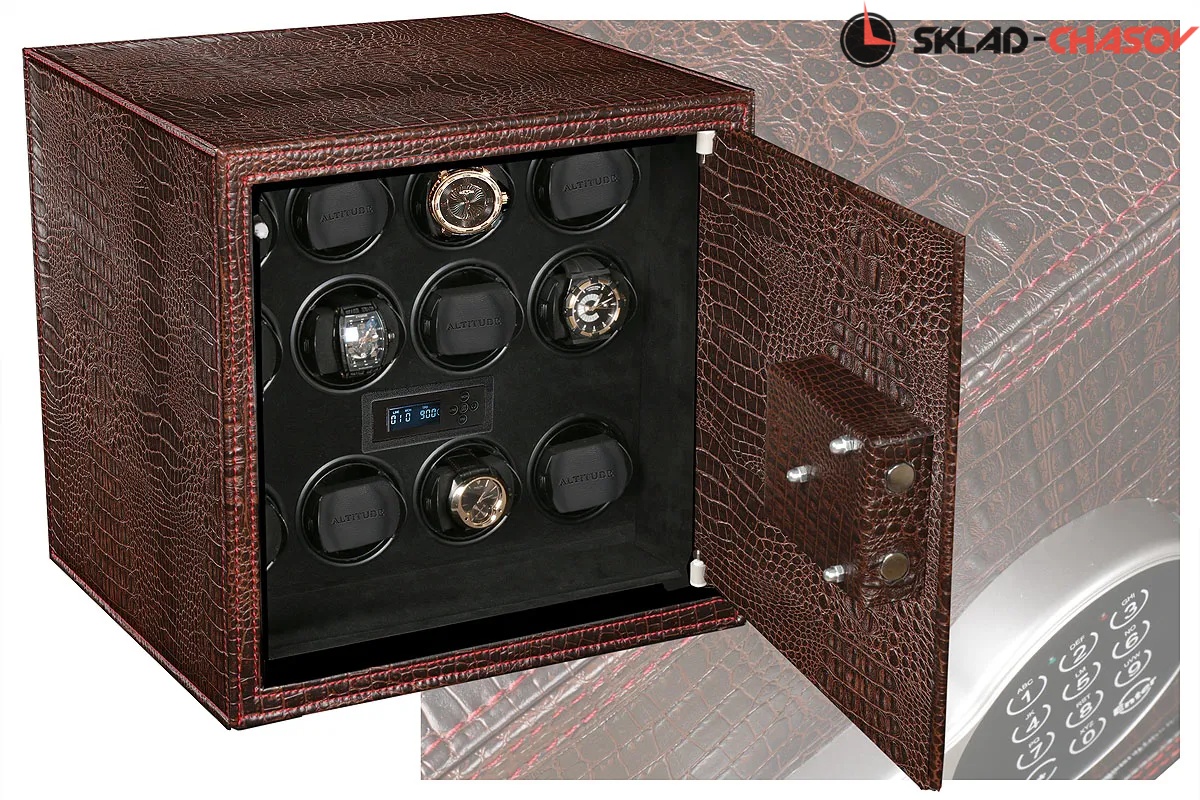 Сейф для Подзавода и Хранения 12 наручных часов с функцией независимого Подзавода обеспечивает полный завод любых часов с любой сложностью от немецкого производителя "Altitude“. Корпус из металла обшит коричнево - бордовой кожей с красной строчкой, внутри выстлана чёрная микрофибра - удобно для сухой и влажной чистки! Минимальный размер на это количество часов. Сейф можно встроить в гардеробную или другое место. Удобные телескопические держатели для любого размера часов. Электронное табло. Внутренняя автоматическая подсветка из светодиодов при открытии дверцы.