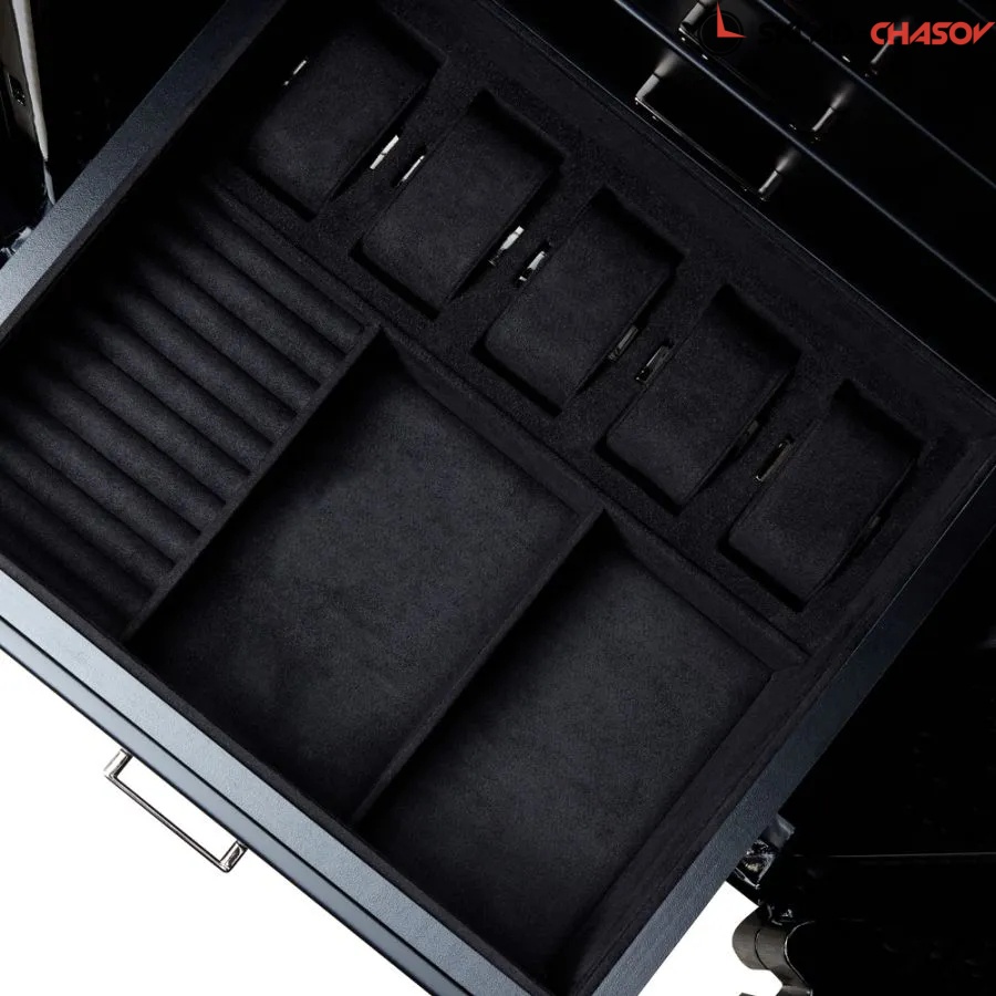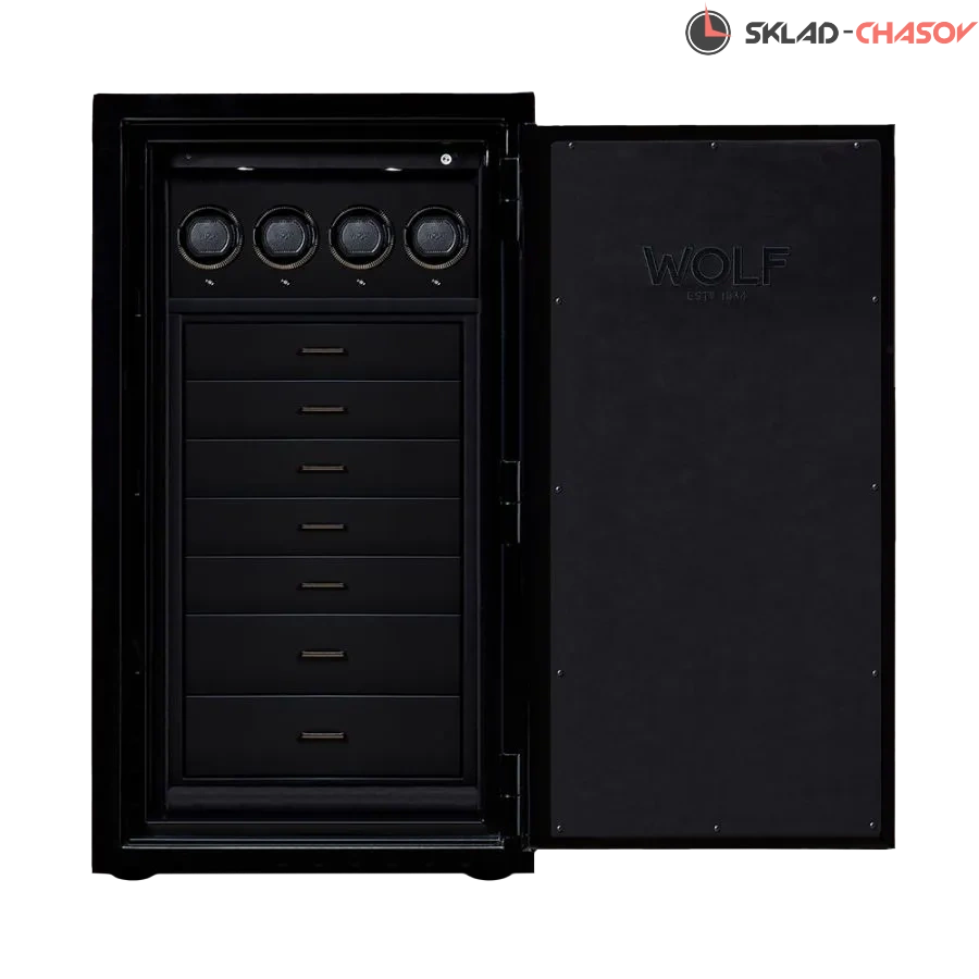 Коллекция Atlas — это воплощение передовых технологий, непревзойдённого стиля и надёжности, достойной лучших часовых и ювелирных коллекций. Сейф изготавливается исключительно под заказ. Фурнитура сейфа выполнена в сдержанном графитовом оттенке, гармонично дополняющем глянцевый чёрный корпус и подчёркивающем его современный минималистичный стиль. Строгий внешний облик сочетается с продуманным внутренним наполнением. Сейф включает 7 выдвижных ящиков: 3 открытых, 2 ювелирных и 2 часовых, обеспечивающих хранение как для аксессуаров, так и для часов. Все они выполнены в фирменной ткани LusterLoc™ матового чёрного цвета, которая защищает изделия от выцветания на срок до 35 лет. Сейф оборудован системой подзавода для 4 наручных часов, с возможностью индивидуальной настройки оборотов и направления вращения для каждого из них. Продуманный комплект разноразмерных подушек для автоподзавода часов подойдет для установки часов любого диаметра с любой длиной ремешка или браслета. Сейф оснащён надёжным электронным кодовым замком с удобной поворотной ручкой для открытия и запирания дверцы. Абсолютно новая дистанционная система управлением шкатулки поражает воображение. Вам достаточно скачать на ваш смартфон приложение WOLF, и вы сможете на расстоянии от шкатулки настроить подзавод каждых часов / запустить или остановить все ячейки для подзавода. Это мировая новинка, созданная английской компанией. Все сделано с любовью и удобством в пользовании. Важно отметить, что вся продукция премиального бренда изготавливается вручную с использованием экологически чистых материалов. Более того, конструкция огне- и водонепроницаема, что подтверждено независимыми испытаниями. Сертификация UL гарантирует: — огнестойкость при температуре до 927°C в течение 120 минут, с последующим испытанием падением с высоты 9 метров; — во время пожара внутренняя температура не превышает 177°C, что полностью исключает риск возгорания документов (для справки: бумага загорается при 232°C); — противопожарное уплотнение Palusol® расширяется в 8 раз, герметично закрывая дверцу и защищая содержимое от воздействия высоких температур и влаги.