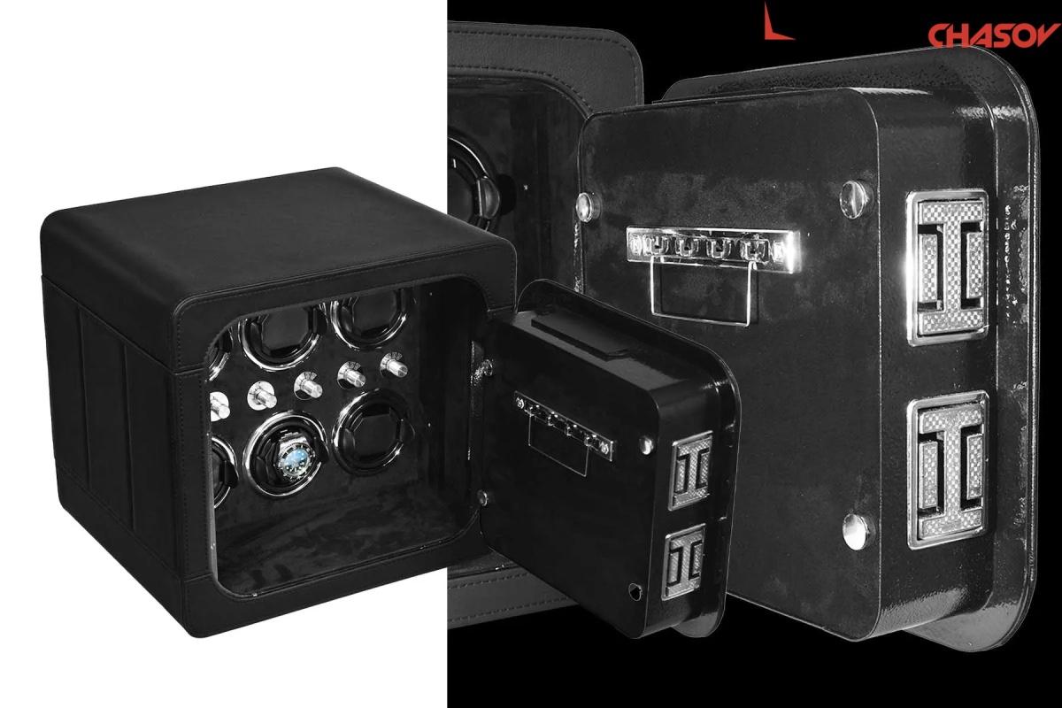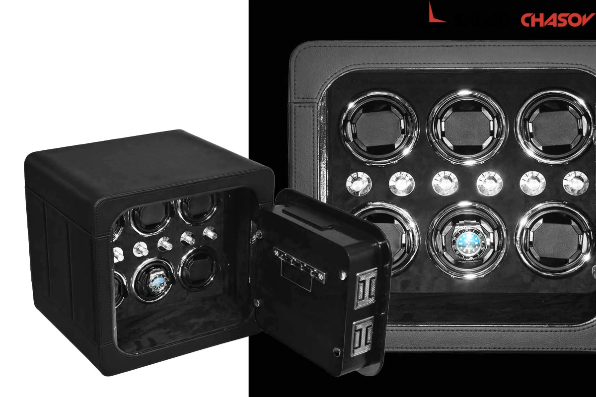 Новая линейка от немецкого производителя "Altitude" позволяет использовать эти удобные, красивые, функциональные сейфы в интерьере или в потайных местах, возможно прикрутить его к стене или встроить, нужен только источник питания 220 вольт или блок с батарейками. Открытие несколькими способами, отпечаток пальца, электронный замок и ключ. Сейф обшит чёрной кожей с строчкой. Внутри выстлан чёрной алькантарой с черными телескопическими держателями для часов, фиксация внутри стакана, полный профессиональный подход к хранению и подзавода ваших 6 часов с регулировкой направления вращения каждого держателя. Сейф 2 категории прекрасно защитит ваше часы в случаи взлома. Работает также от пульта, есть светодиодная подсветка.