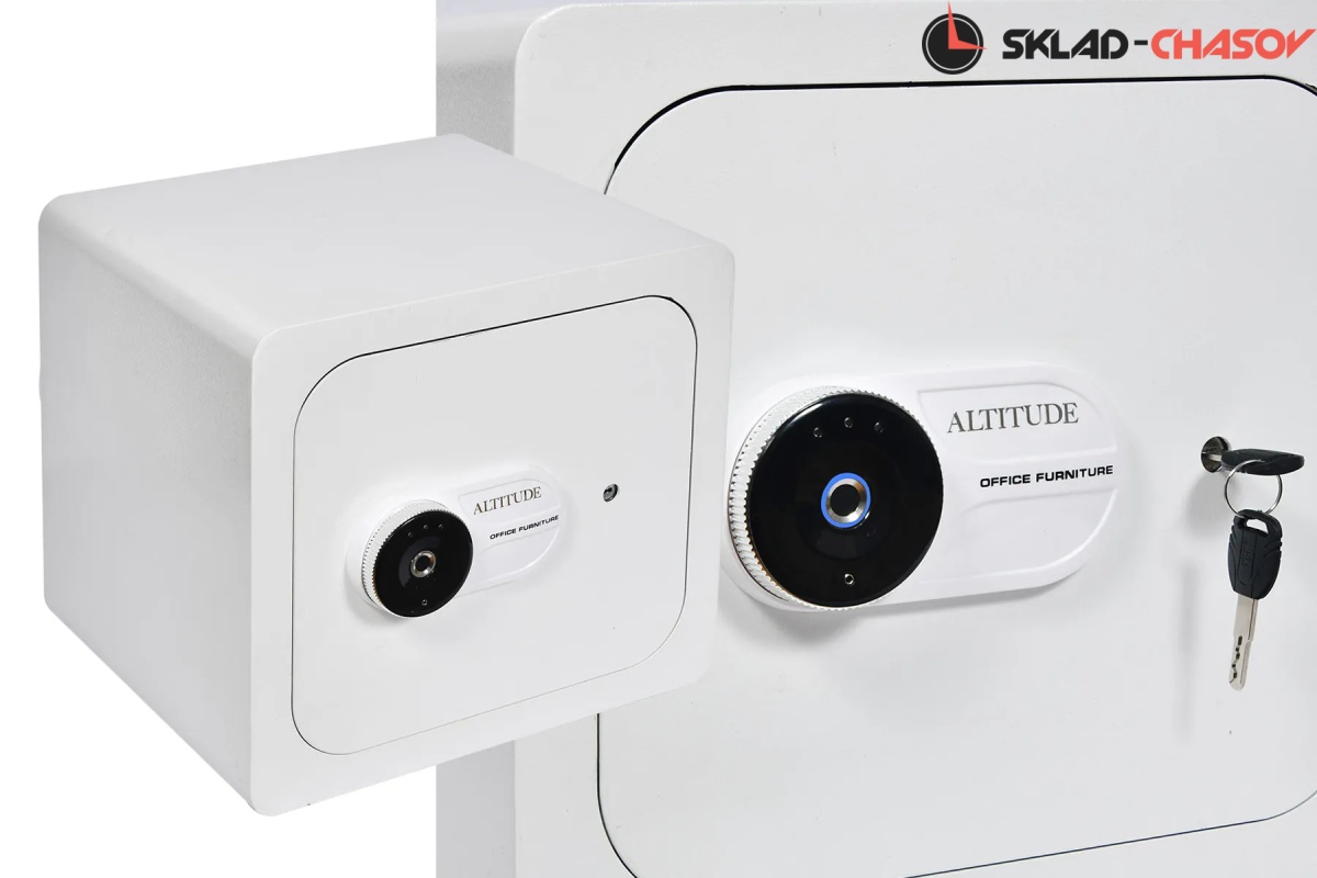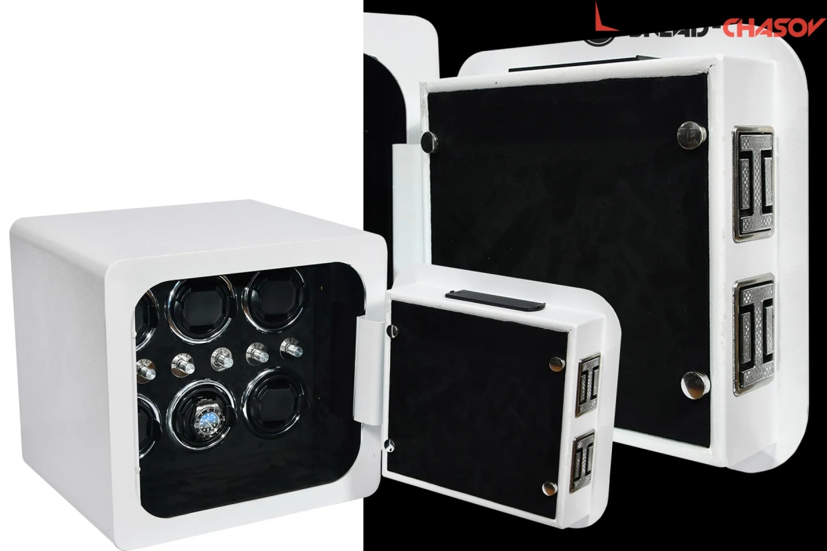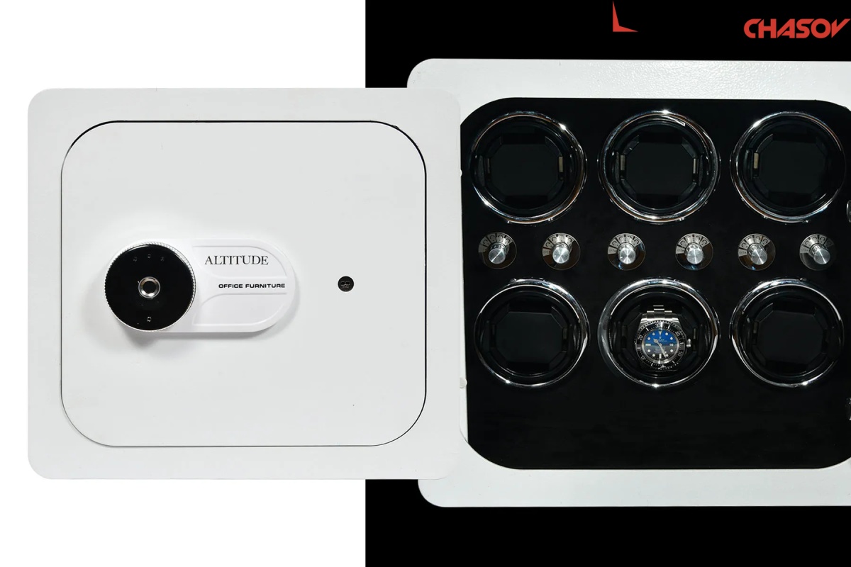 Новая линейка от немецкого производителя "Altitude" позволяет использовать эти удобные, красивые, функциональные сейфы в интерьере или в потайных местах, возможно прикрутить его к стене или встроить, нужен только источник питания 220 вольт или блок с батарейками. Открытие несколькими способами, отпечаток пальца, электронный замок и ключ. Сейф из металла белого цвета. Внутри выстлан чёрной алькантарой с черными телескопическими держателями для часов, фиксация внутри стакана, полный профессиональный подход к хранению и подзавода ваших 6 часов с регулировкой направления вращения каждого держателя. Сейф 2 категории прекрасно защитит ваше часы в случаи взлома. Работает также от пульта, есть светодиодная подсветка.