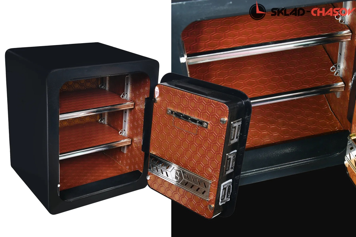 Новая модель сейфа “Victory”. Чёрный металлический сейф для свободного, удобного назначения, можно дополнительно комплектовать кубиками для подзавода часов, можно использовать лоток для украшений. Современное открытие с помощью отпечатка пальцев.