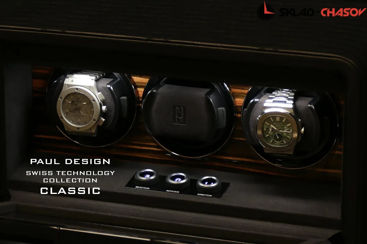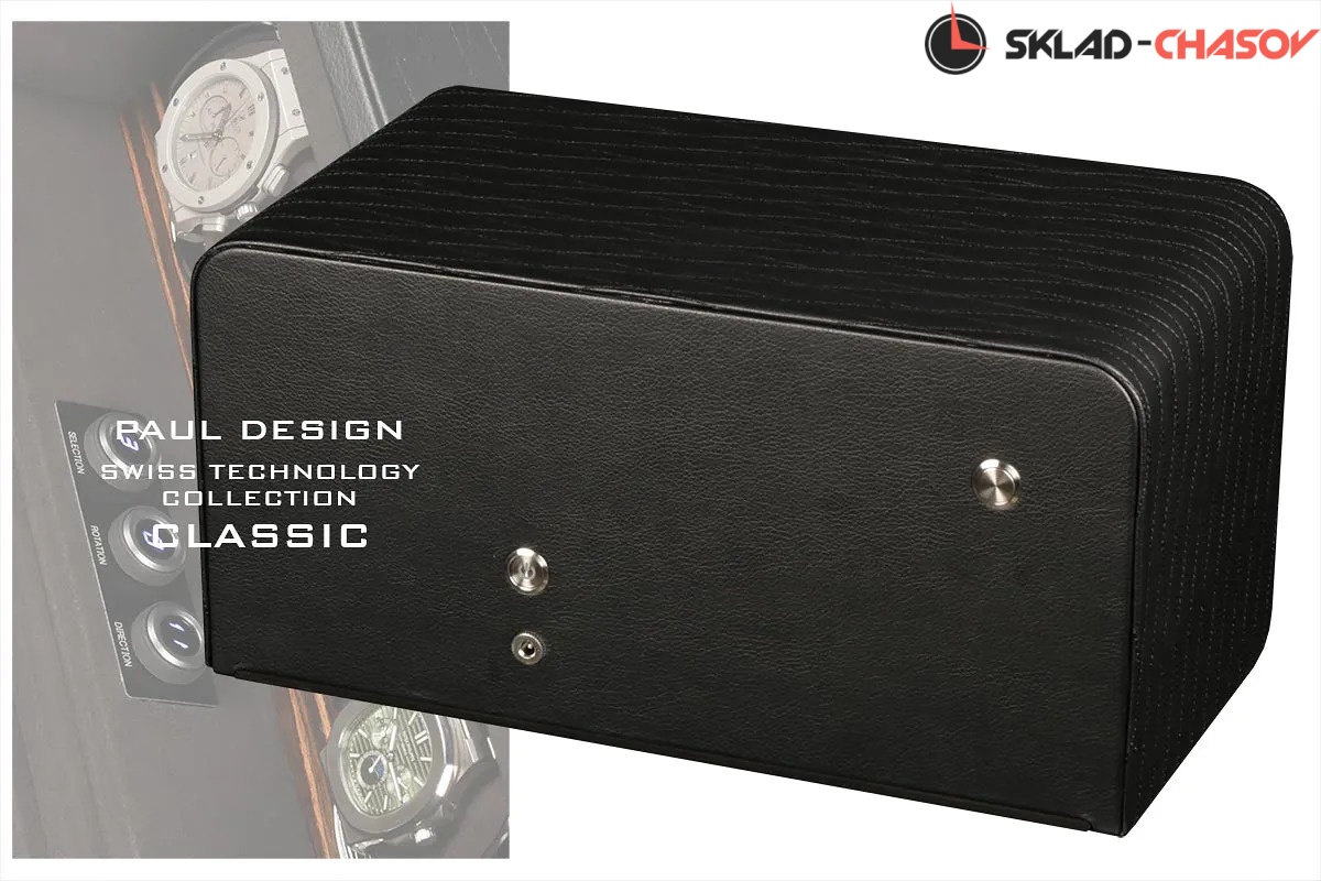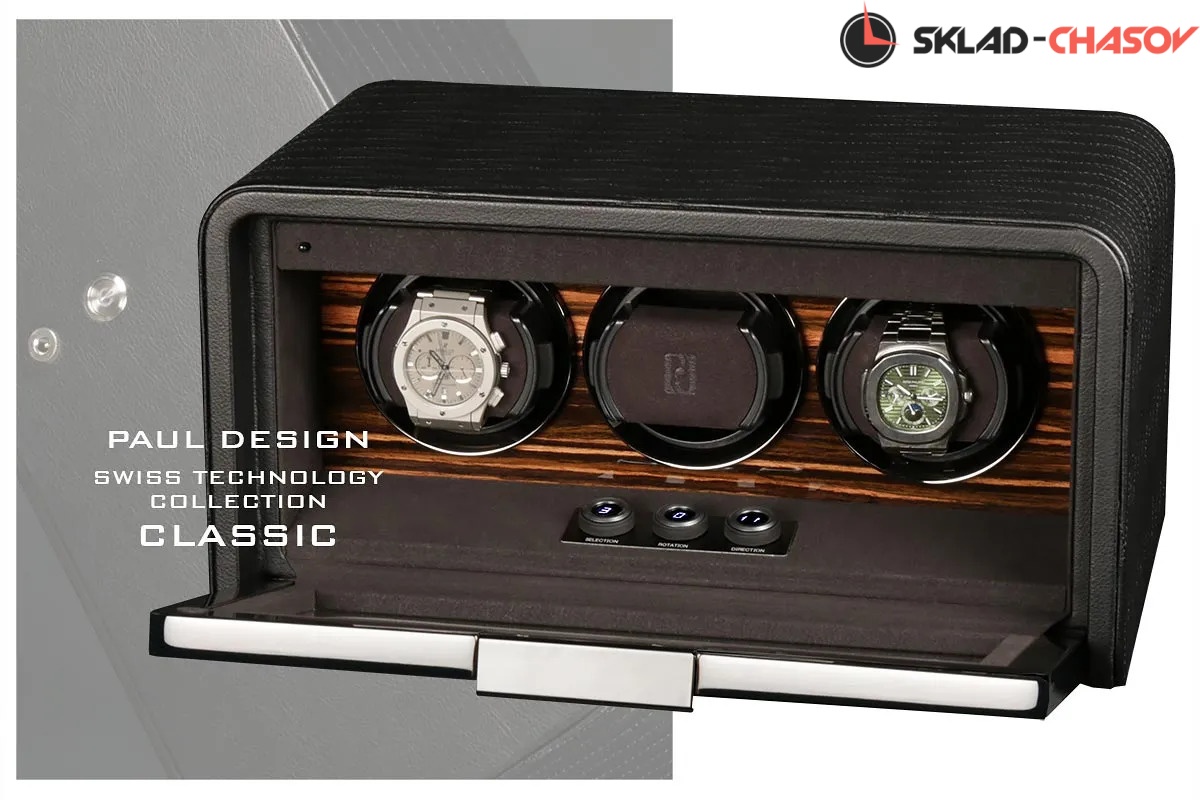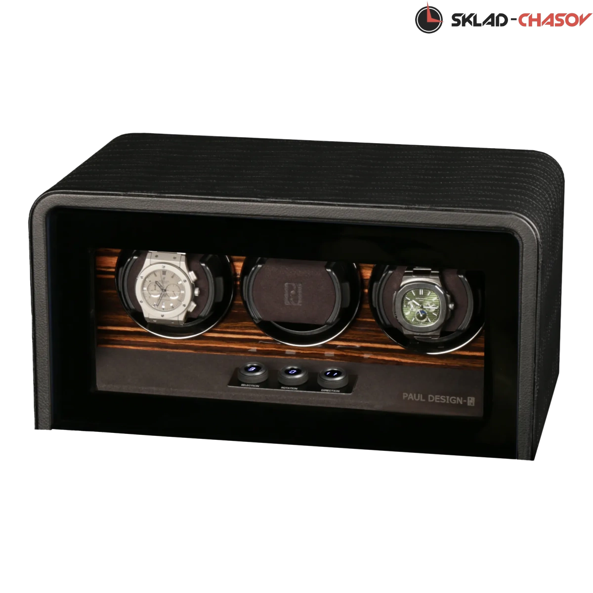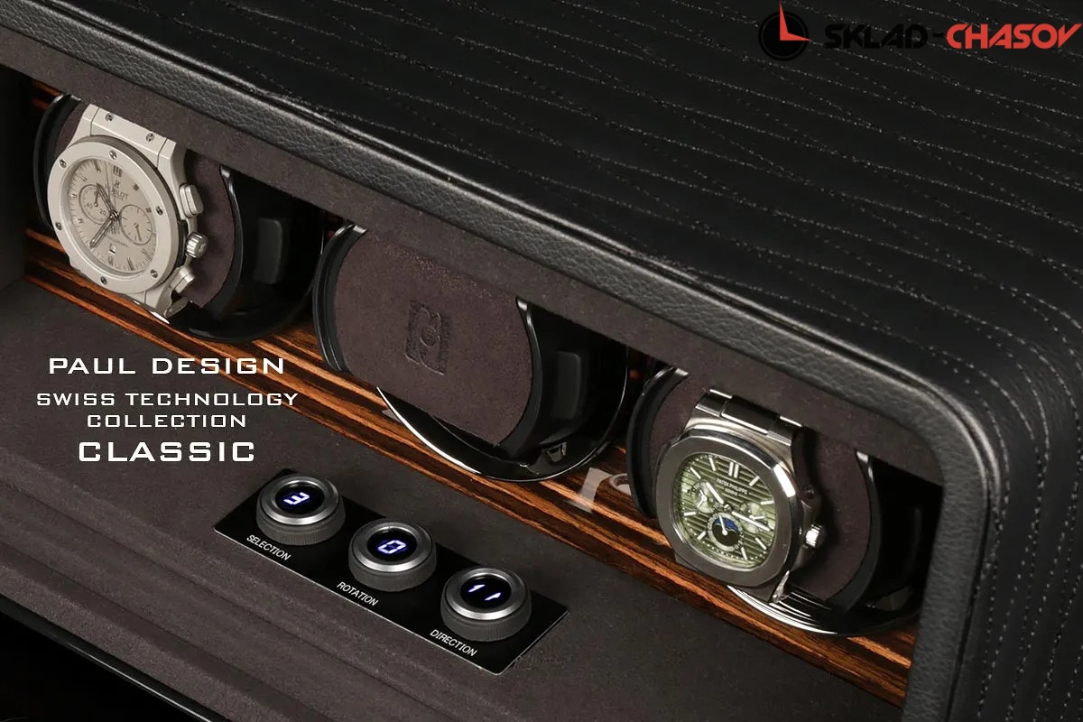 Элегантная шкатулка для автоподзавода 3-х часов Classic 3 LBK от Paul Design сочетает классический дизайн и современные технологии. Корпус выполнен из дерева и обтянут чёрной кожей с изящной декоративной прострочкой. Интерьер отделан мягкой микрофиброй графитового цвета и украшен вставкой из макассара.